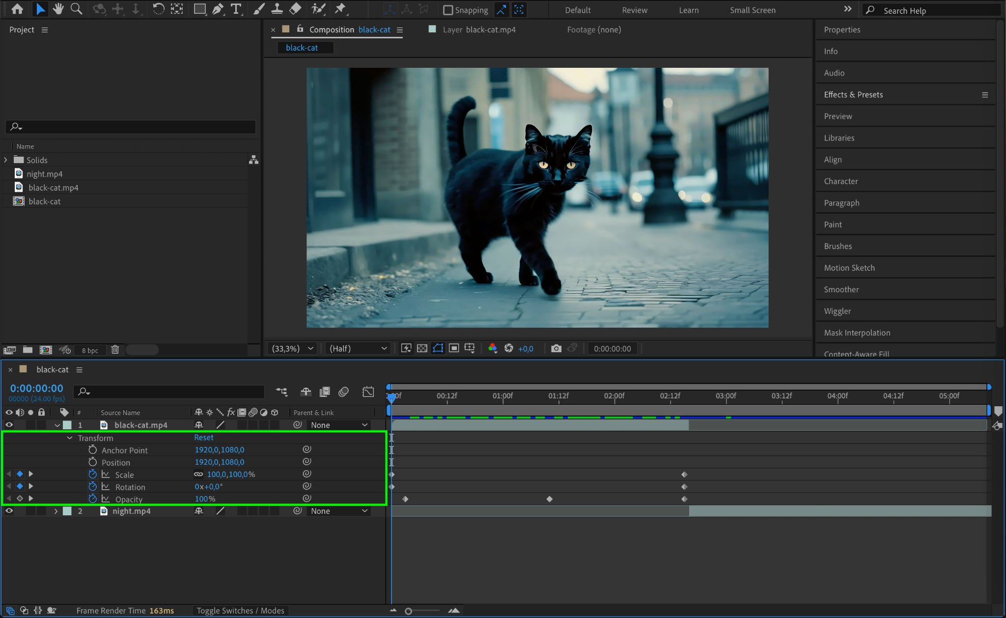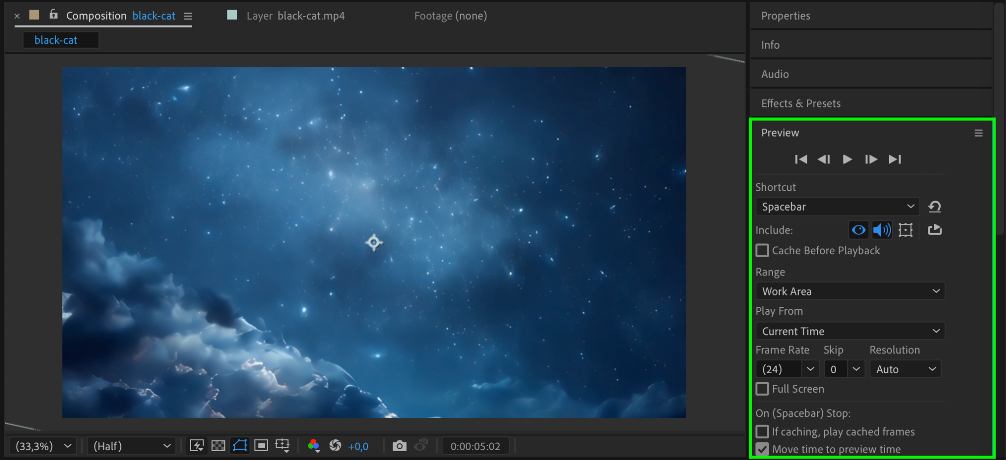 Press the spacebar to preview the animation. Confirm that the transform properties are applied as intended and ensure the movement, scaling, or rotation fits seamlessly into your composition.