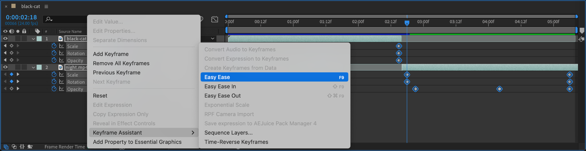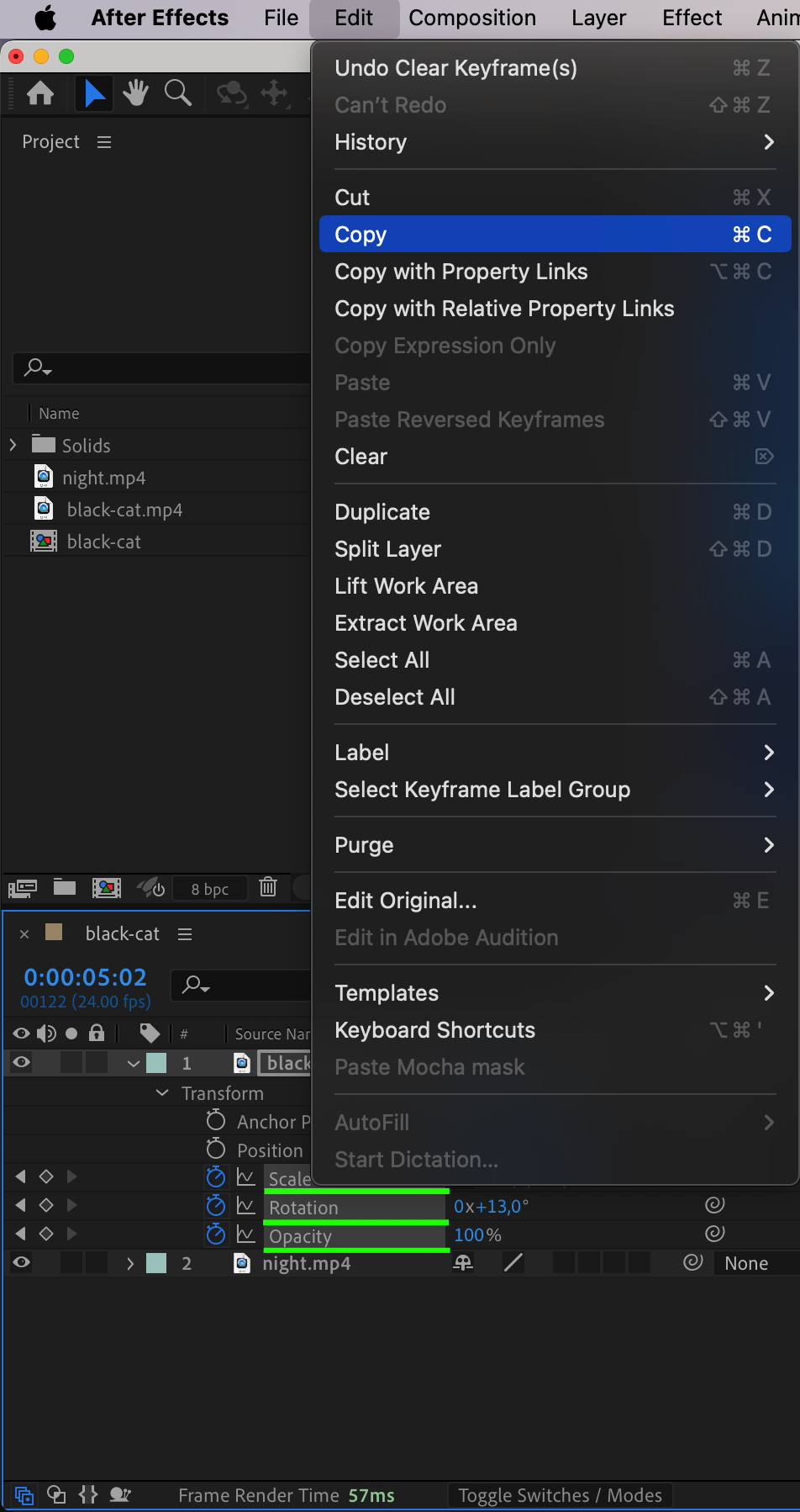 Choose which transform properties you want to copy. You can select individual properties (e.g., Position or Scale) by clicking on their names. If you want to copy keyframes, click and drag over them in the Timeline to highlight. Press “Ctrl/Cmd + C” to copy the selected properties or keyframes.