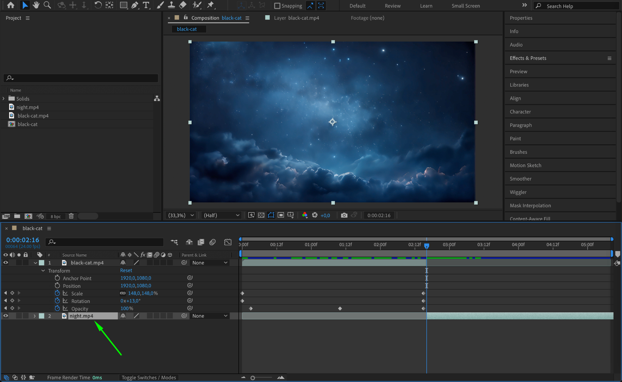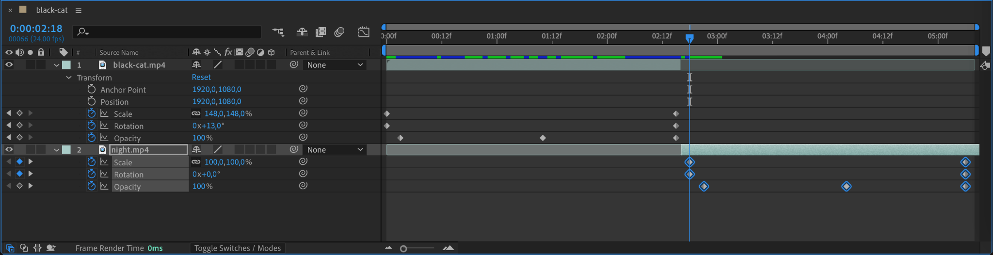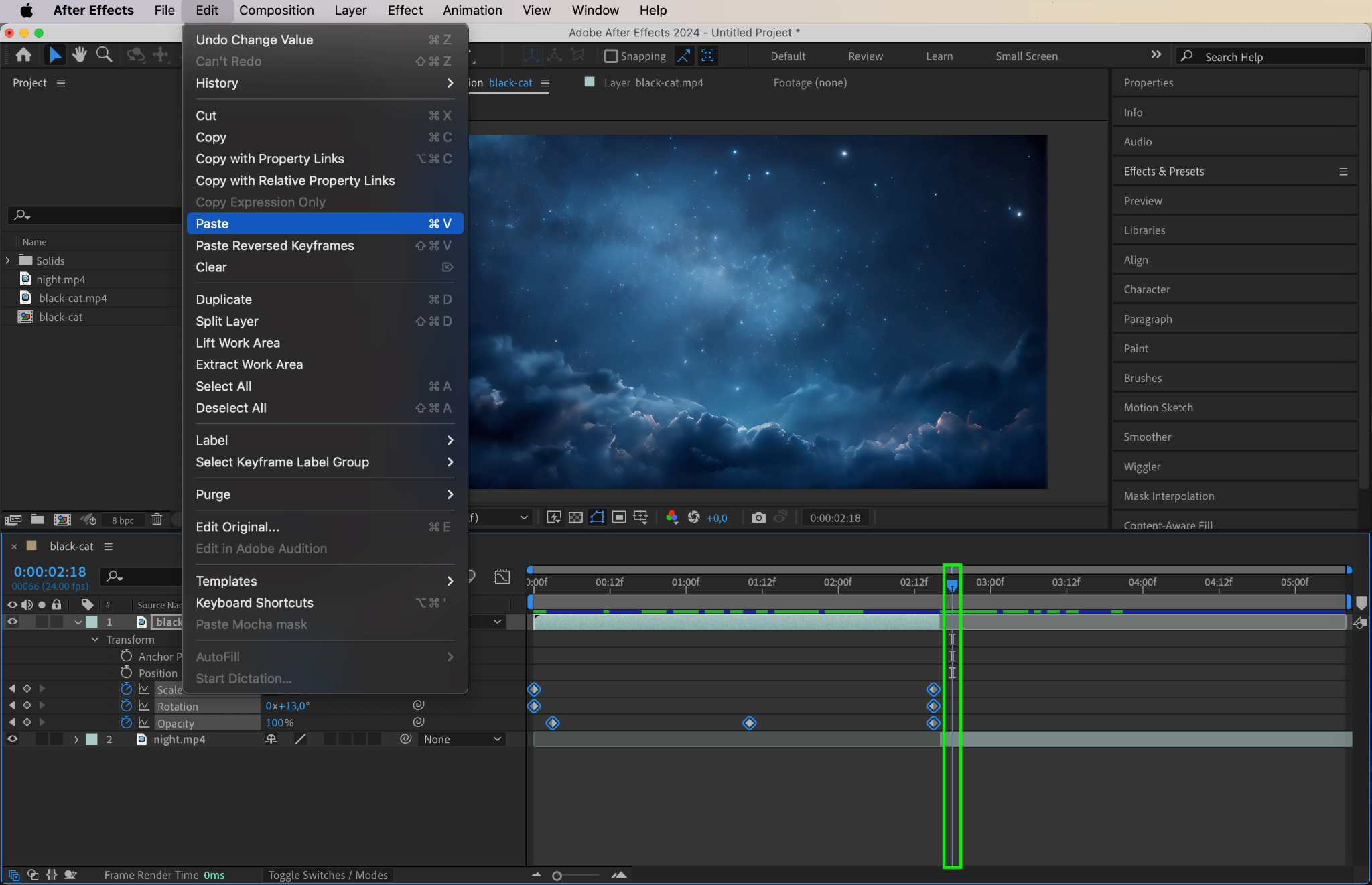 Move the CTI (Current Time Indicator) to the frame where you want the transform properties or keyframes to begin. Press “Ctrl/Cmd + V” to paste the copied properties onto the selected layer(s). The pasted transform settings or animations will now appear in the target layer.