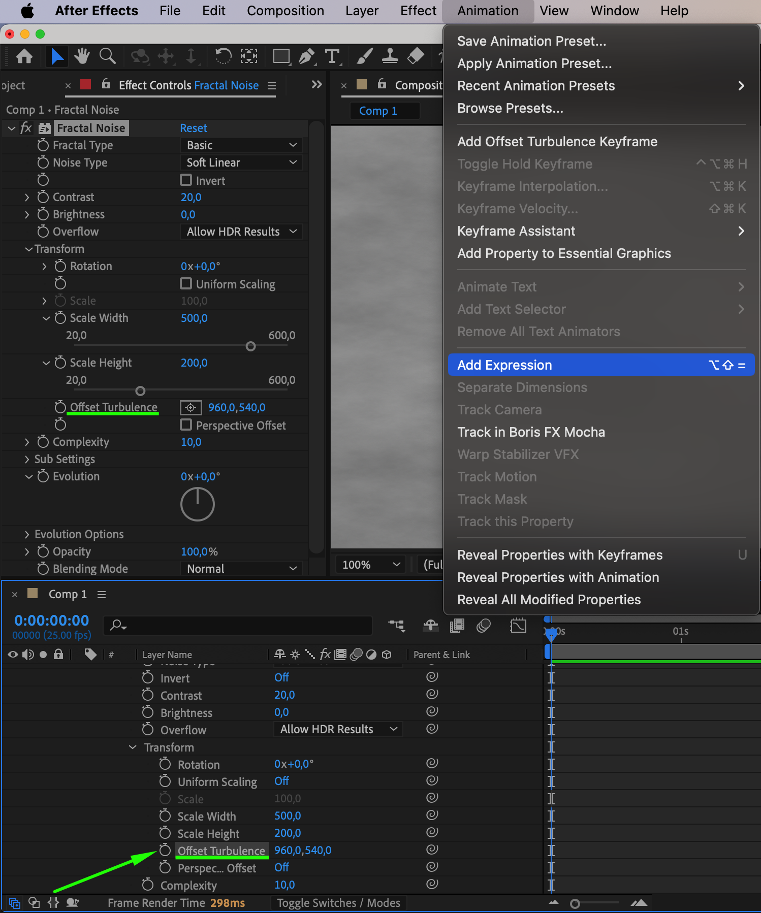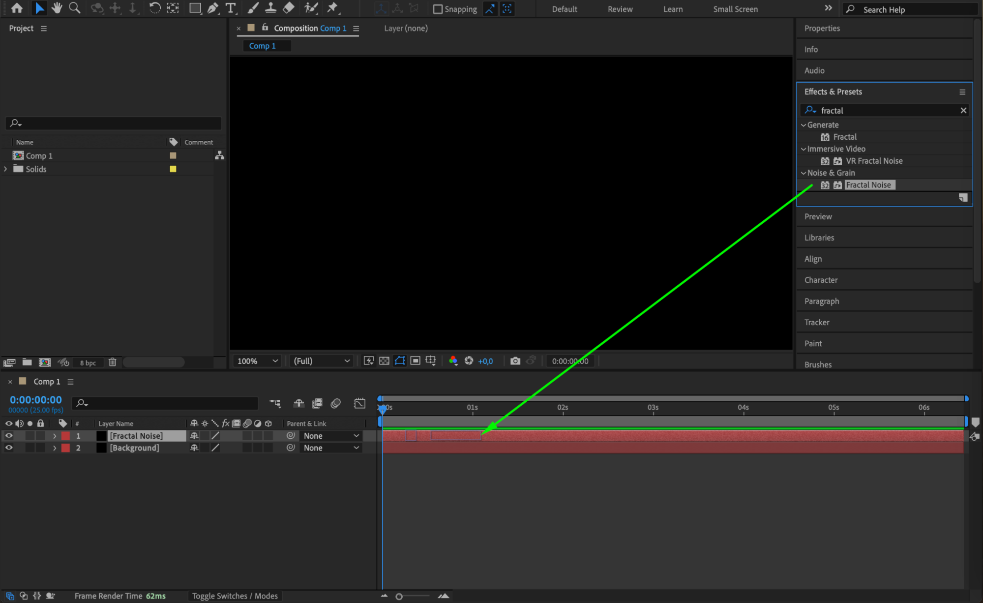 Select the “Fractal Noise” layer. In the Effects & Presets panel, search for Fractal Noise and drag it onto the layer. This effect will create the texture for your fog.