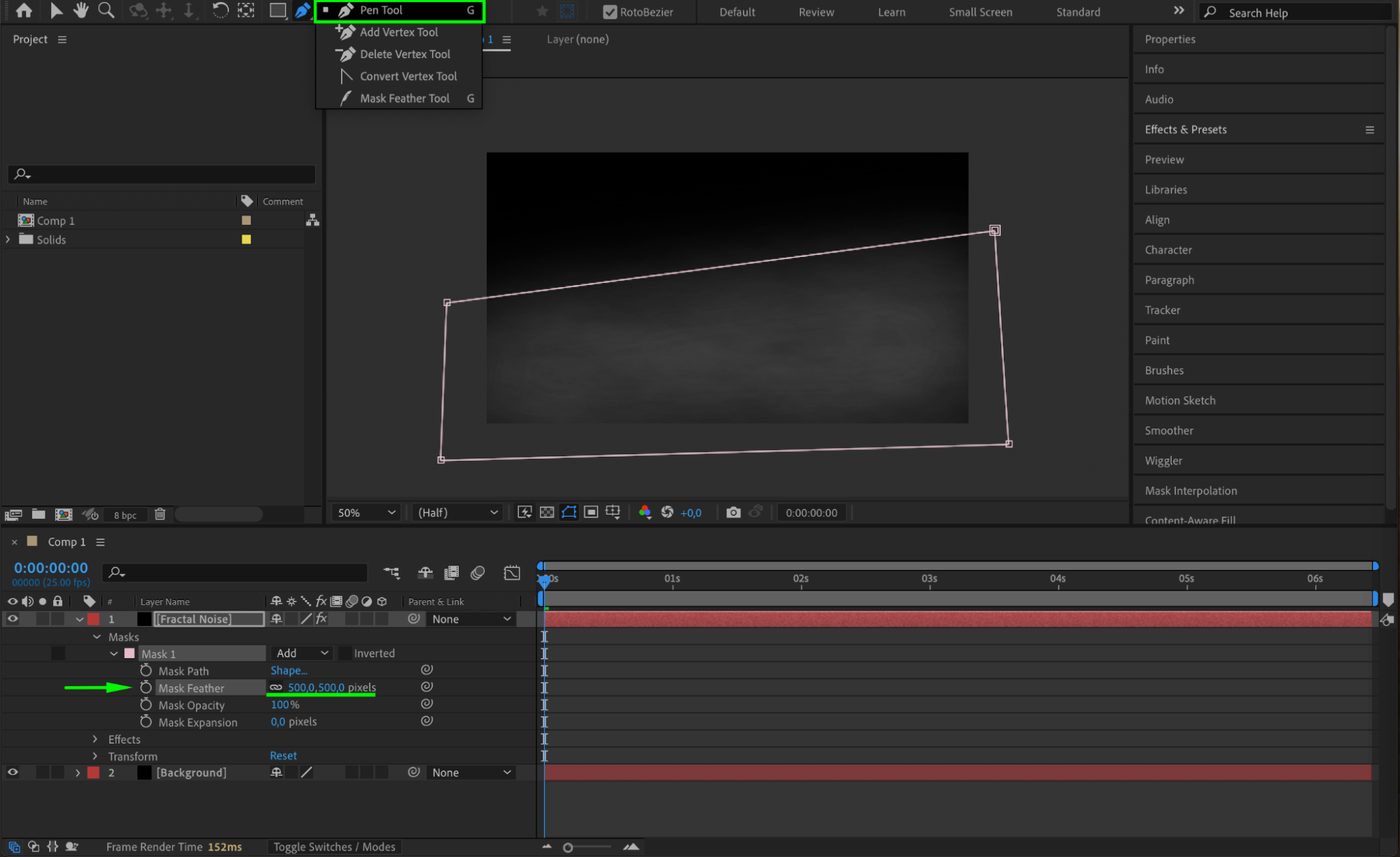 Using the Pen Tool(G), draw a mask on the “Fractal Noise” layer to limit the fog to specific areas in your scene. Adjust the Mask Feather to 500 pixels to blend the fog seamlessly with the environment.
