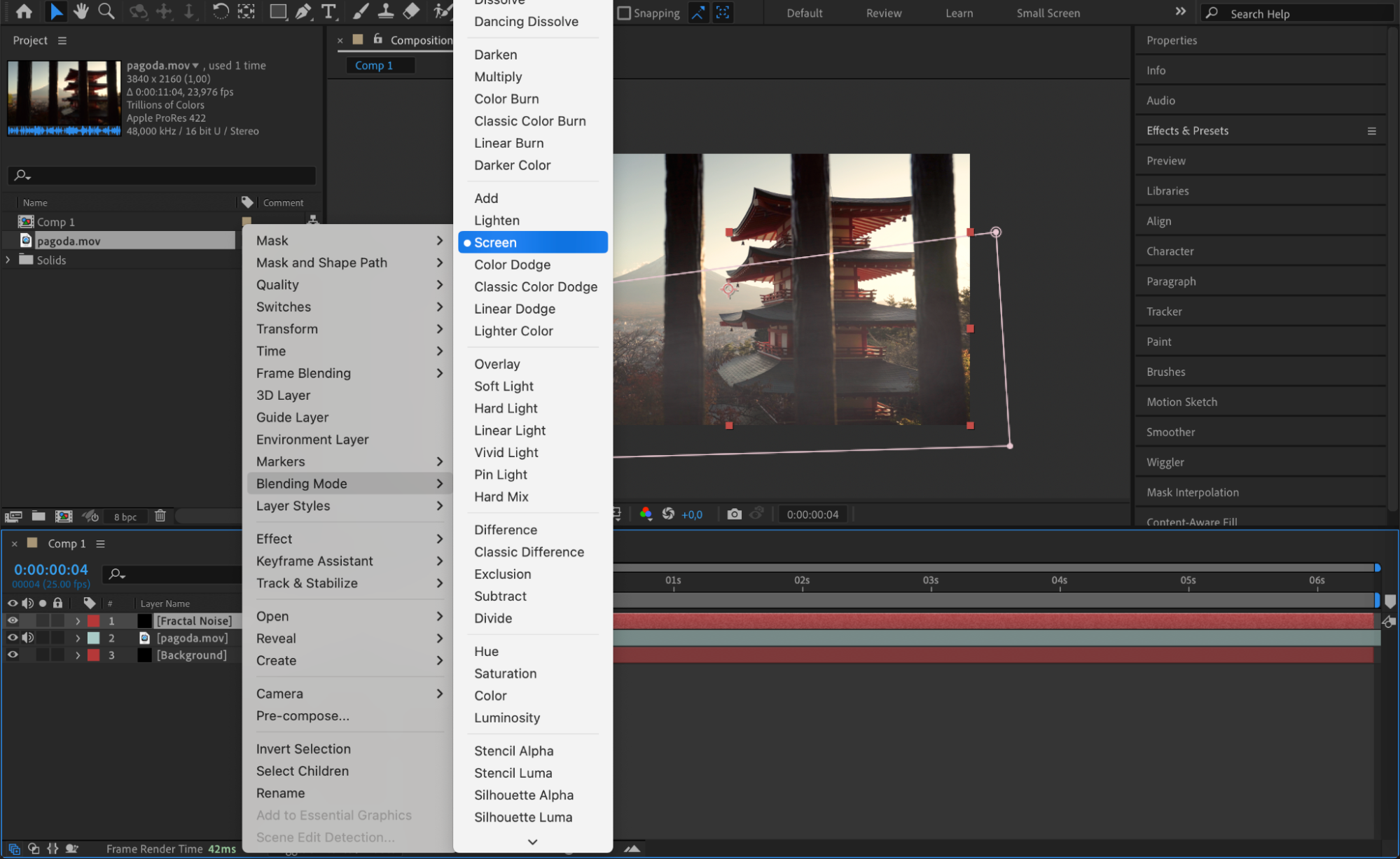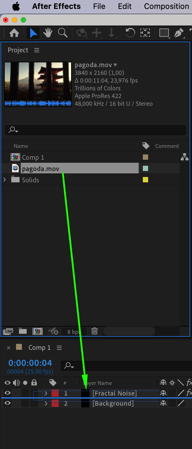 Import the video file you want to enhance with fog and place it below the “Fractal Noise” layer in the timeline. Set the Blending Mode of the “Fractal Noise” layer to Screen to integrate the fog naturally into the footage.