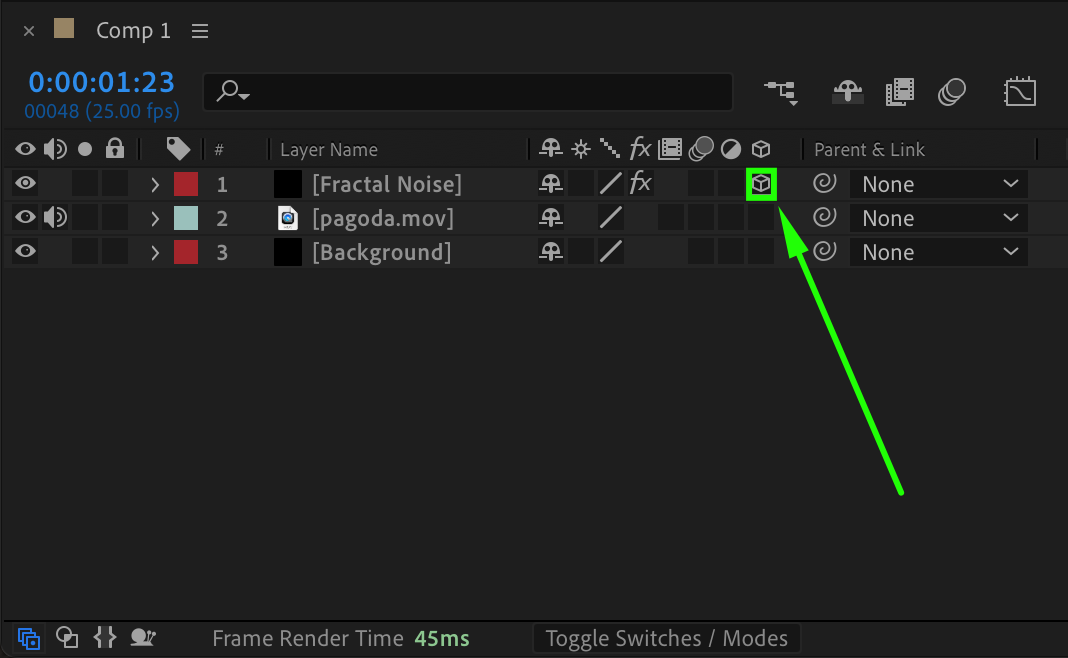Enable the 3D Layer option for the “Fractal Noise” layer in the timeline. This allows the fog to interact with the 3D space in your scene.