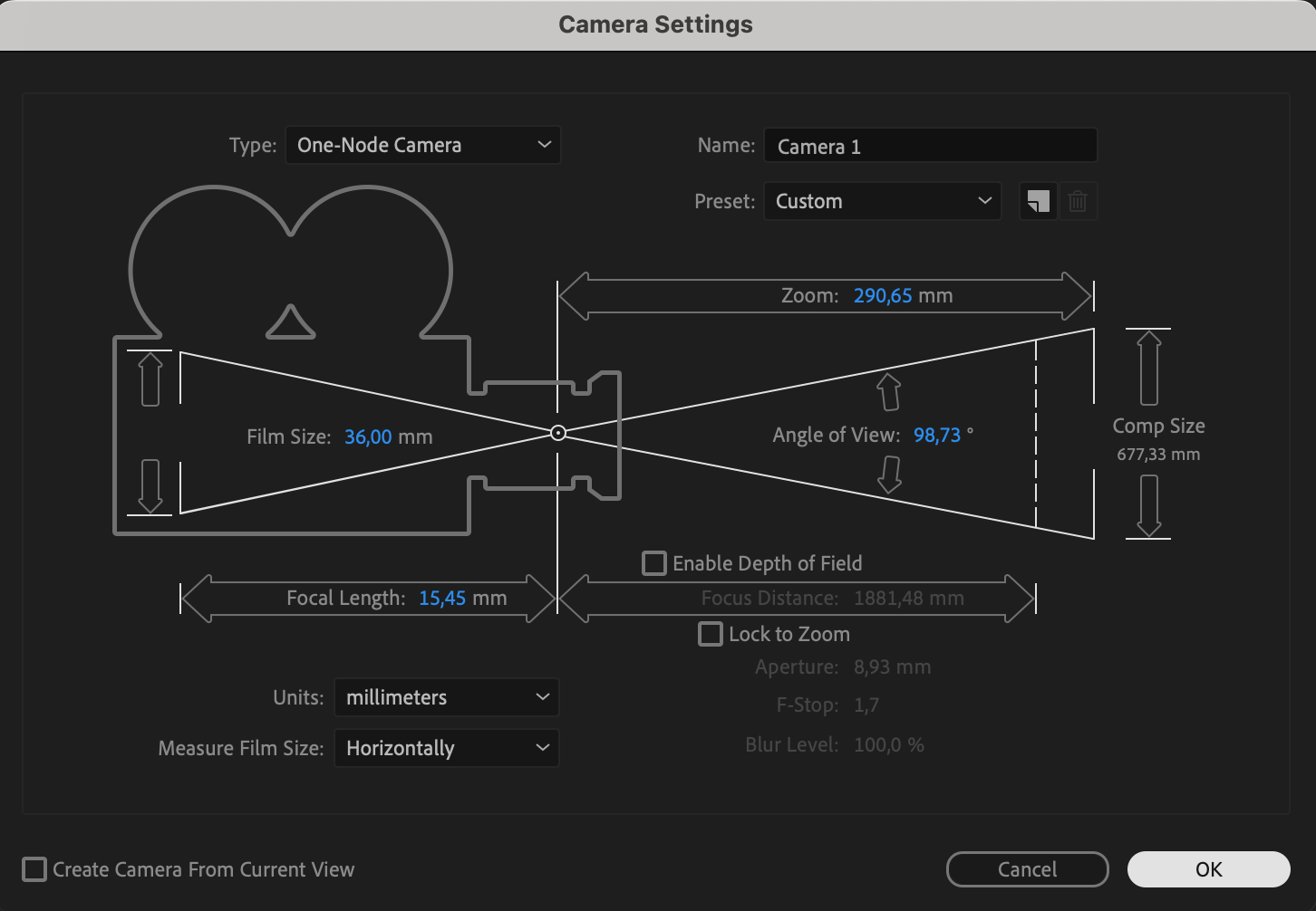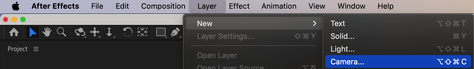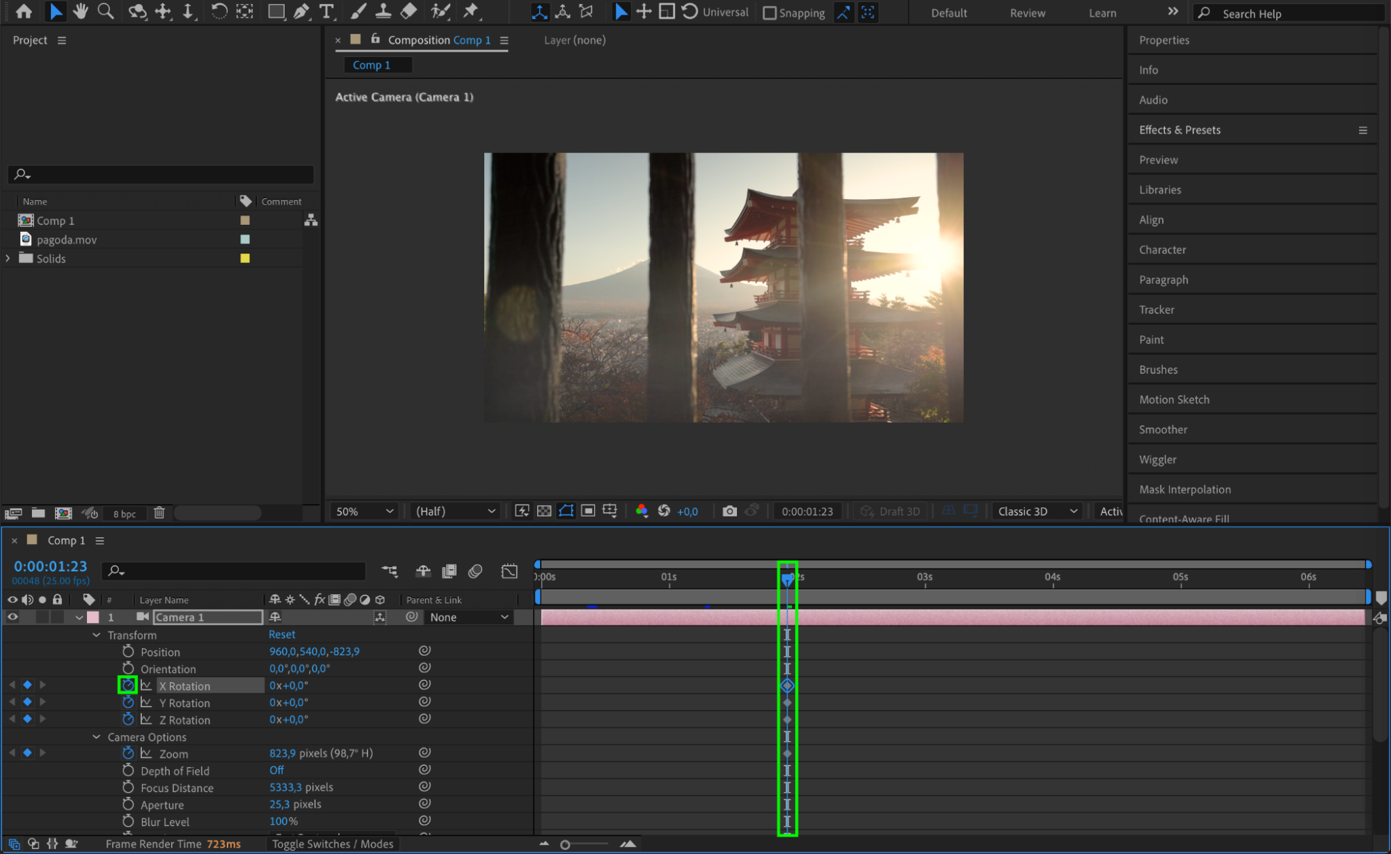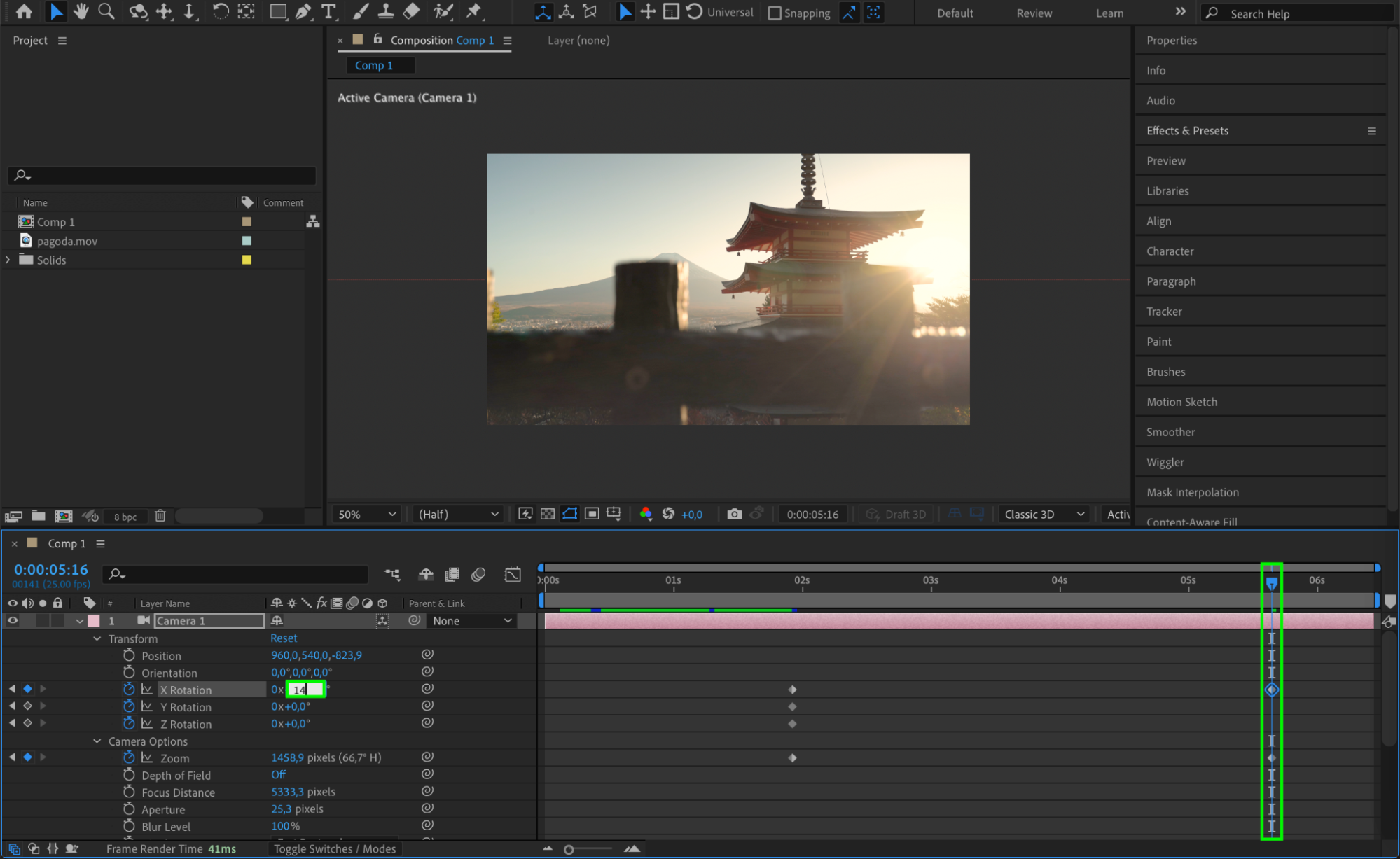 Go to Layer > New > Camera to add a camera. Adjust the camera settings (e.g., focal length) to fit your scene. Expand the camera layer’s properties and animate Zoom and Rotation with keyframes to create smooth camera movements that align with the fog and video.
