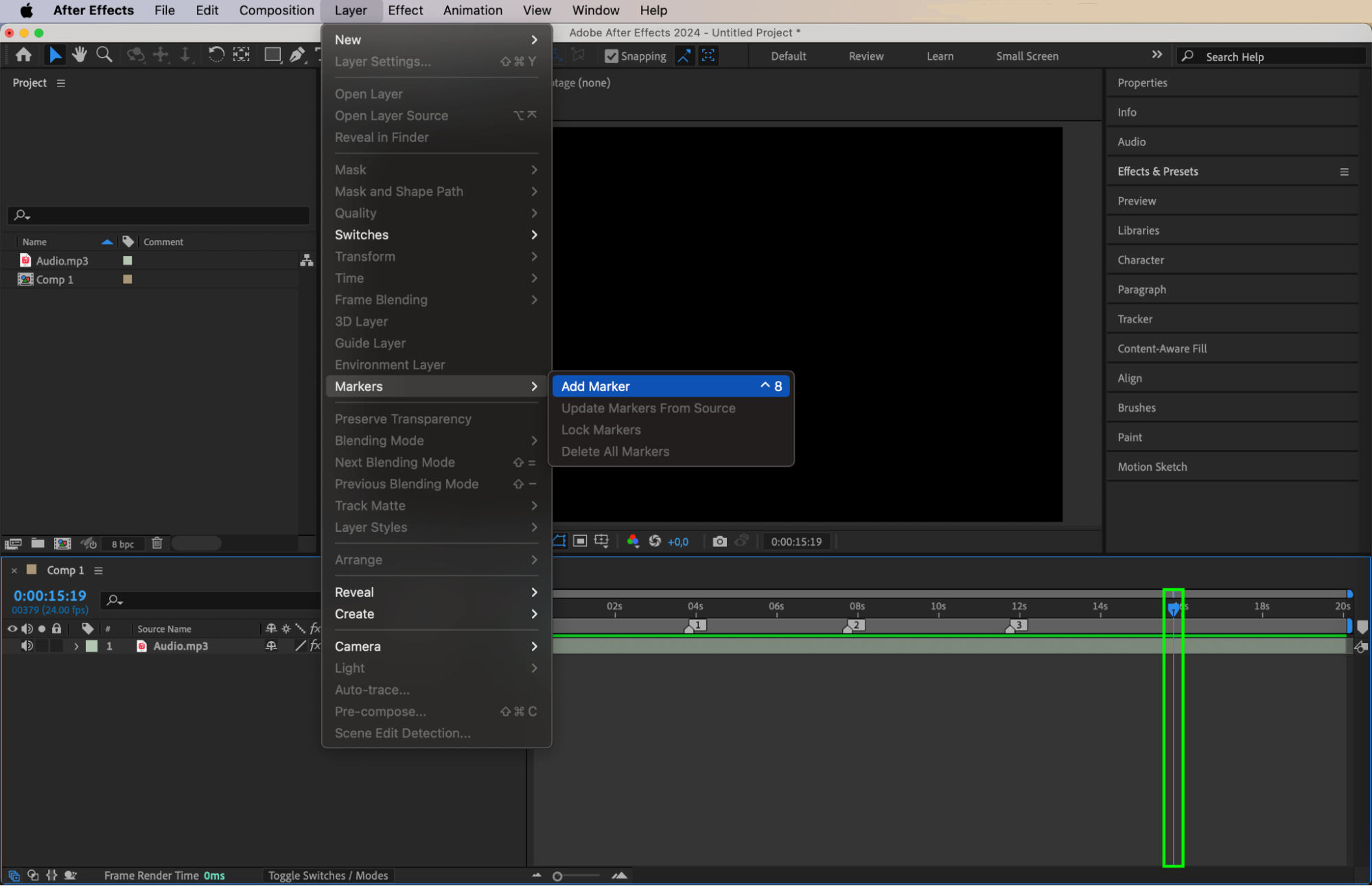To define where the sound will shift between left and right channels, add markers at equal intervals. Select the audio layer, then go to Layer > Marker > Add Marker and place markers at four points throughout the composition.