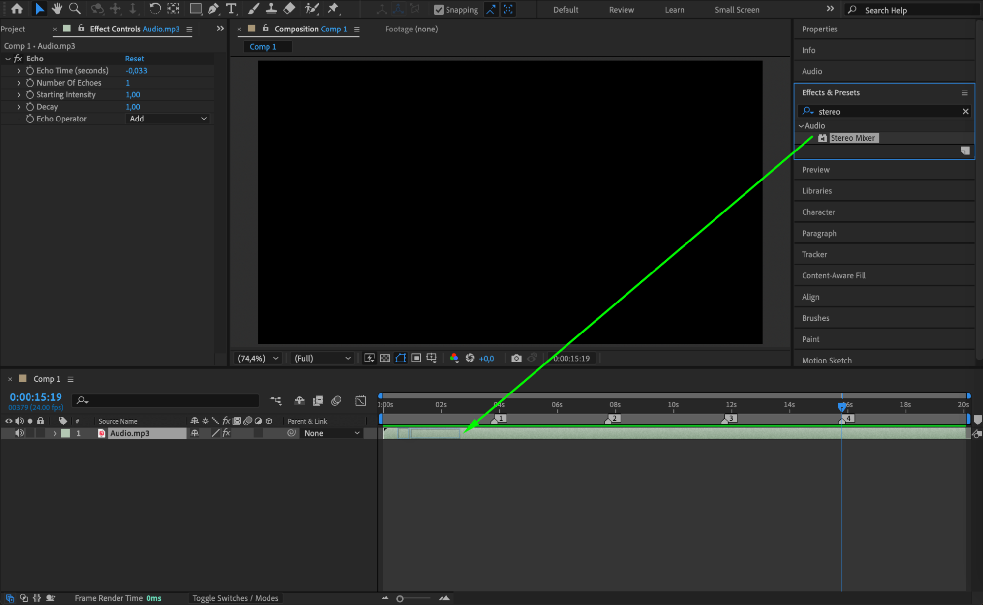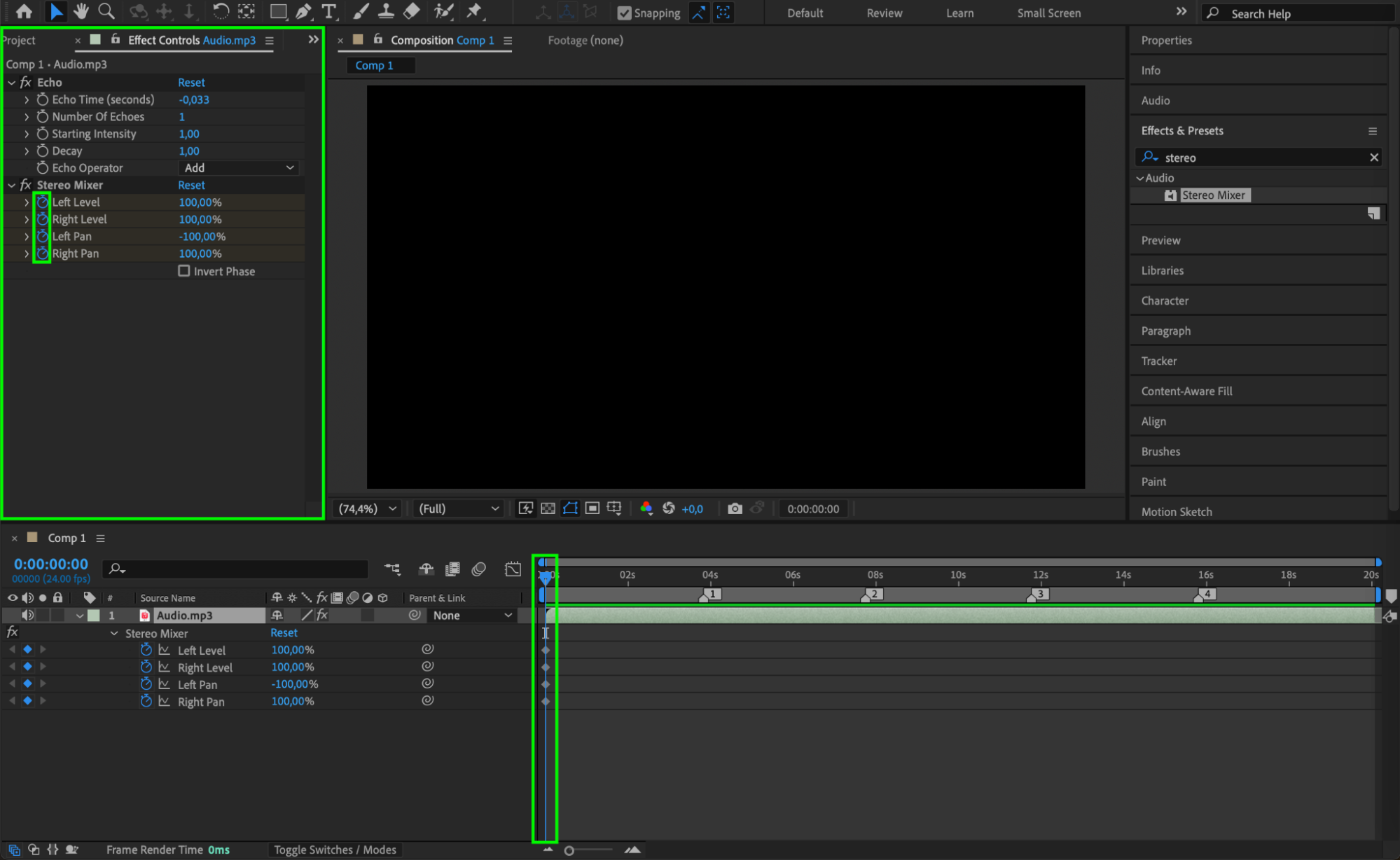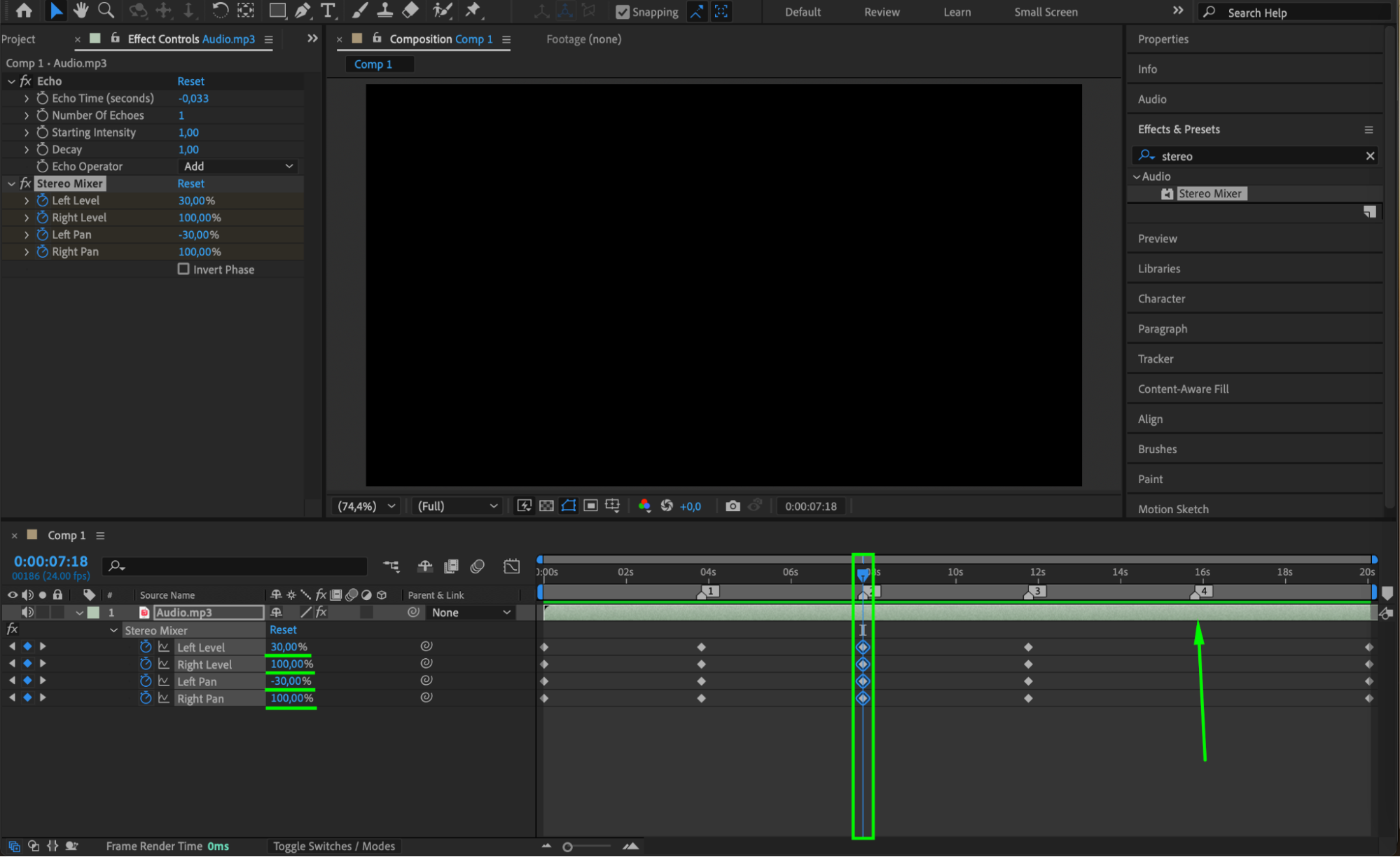 Search for Echo and Stereo Mixer effects in the Effects & Presets panel and apply them to the audio layer. The Echo effect adds depth, while Stereo Mixer controls the panning.