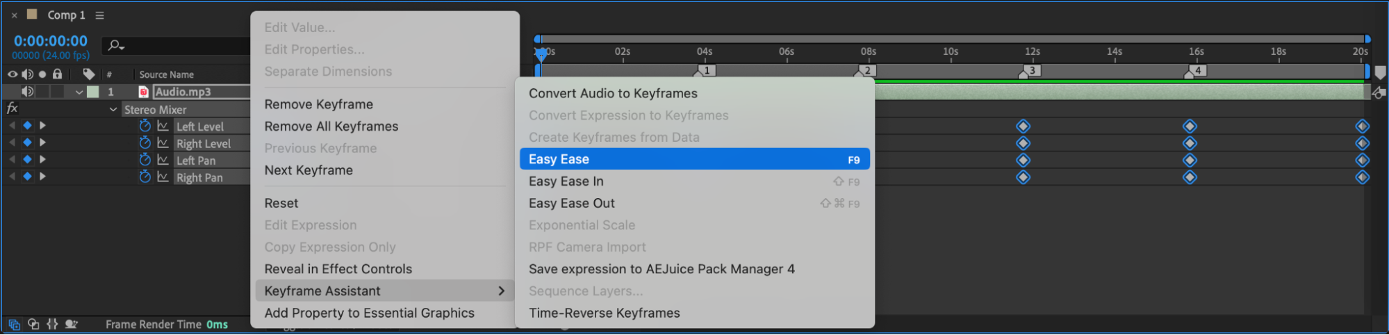Select all keyframes, right-click, and choose Keyframe Assistant > Easy Ease to create a smooth and natural transition between audio movements.