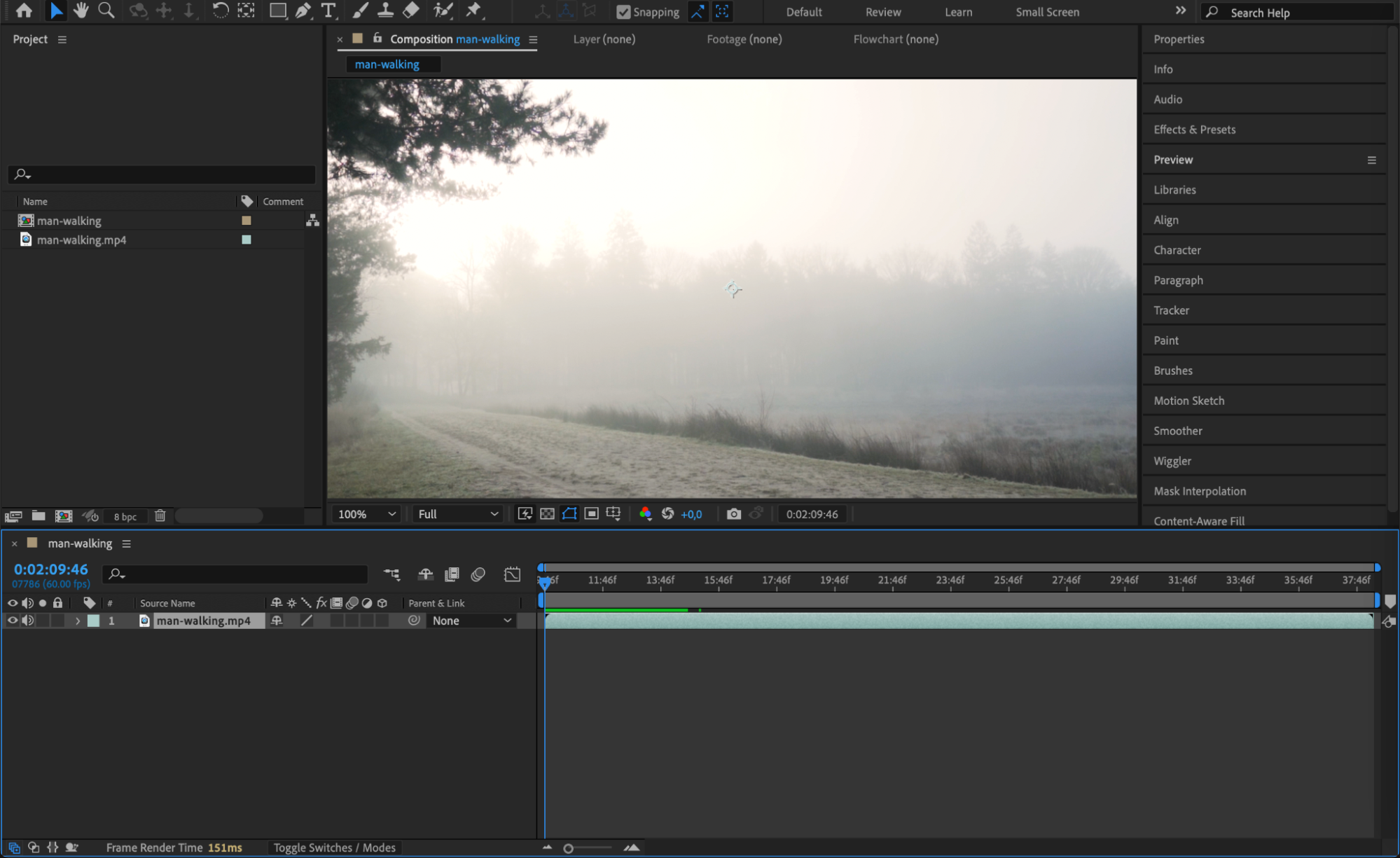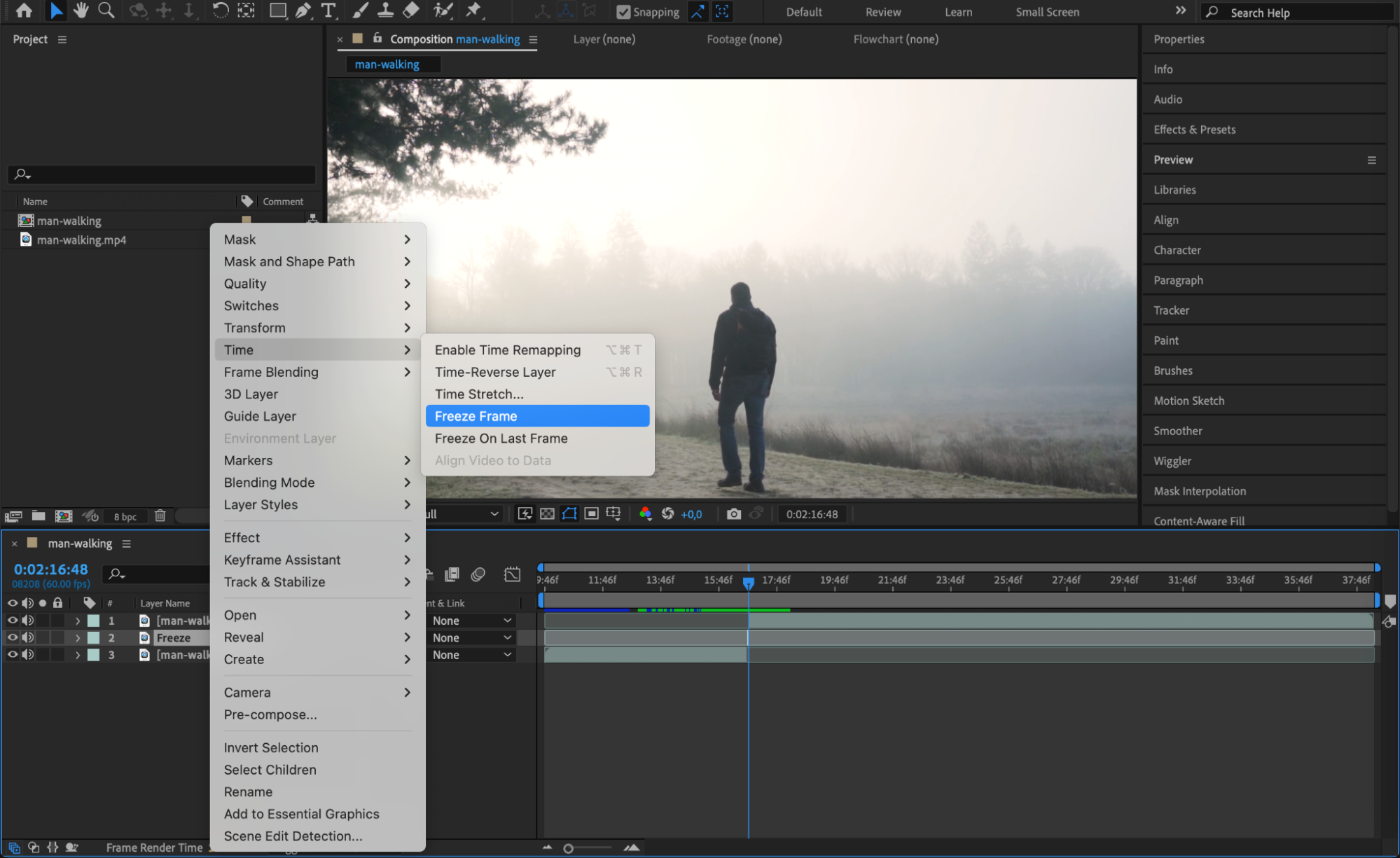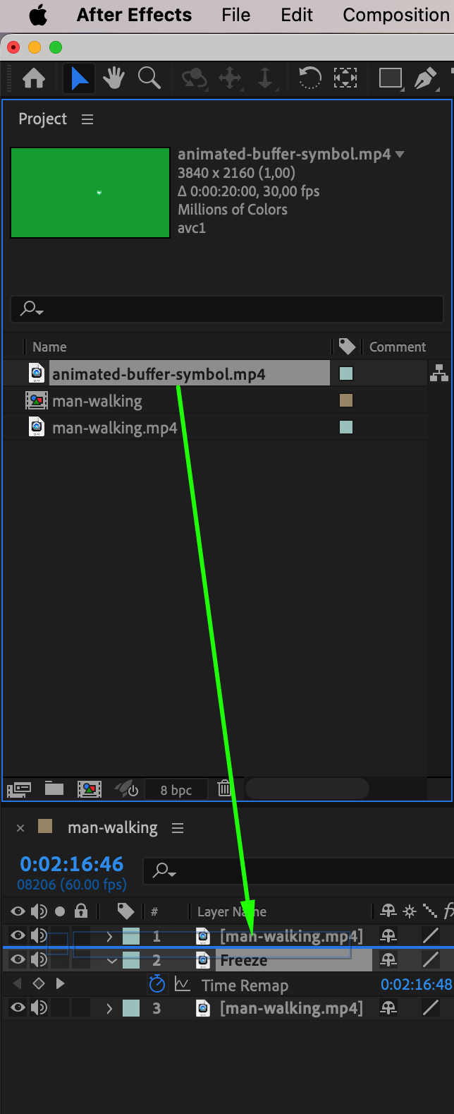 Right-click the 1-frame video layer and go to Time > Freeze Frame. This locks the frame so it stays static instead of playing forward. This is the frame your video will appear “stuck” on during buffering.