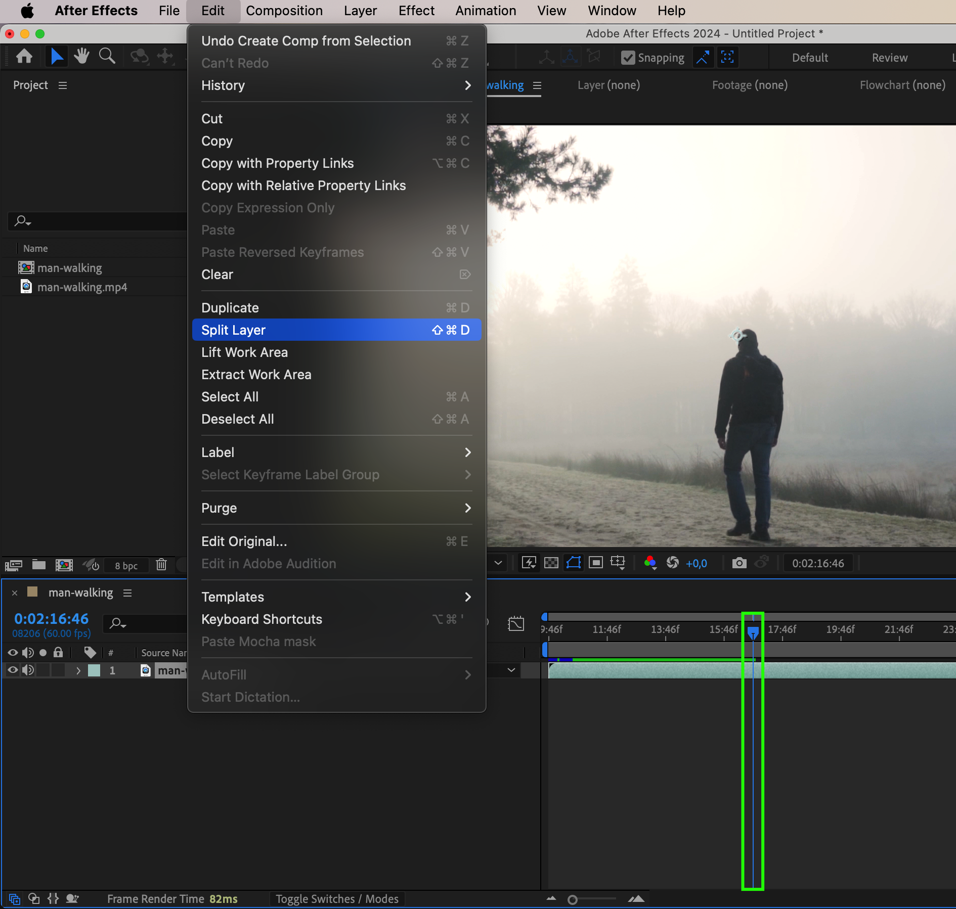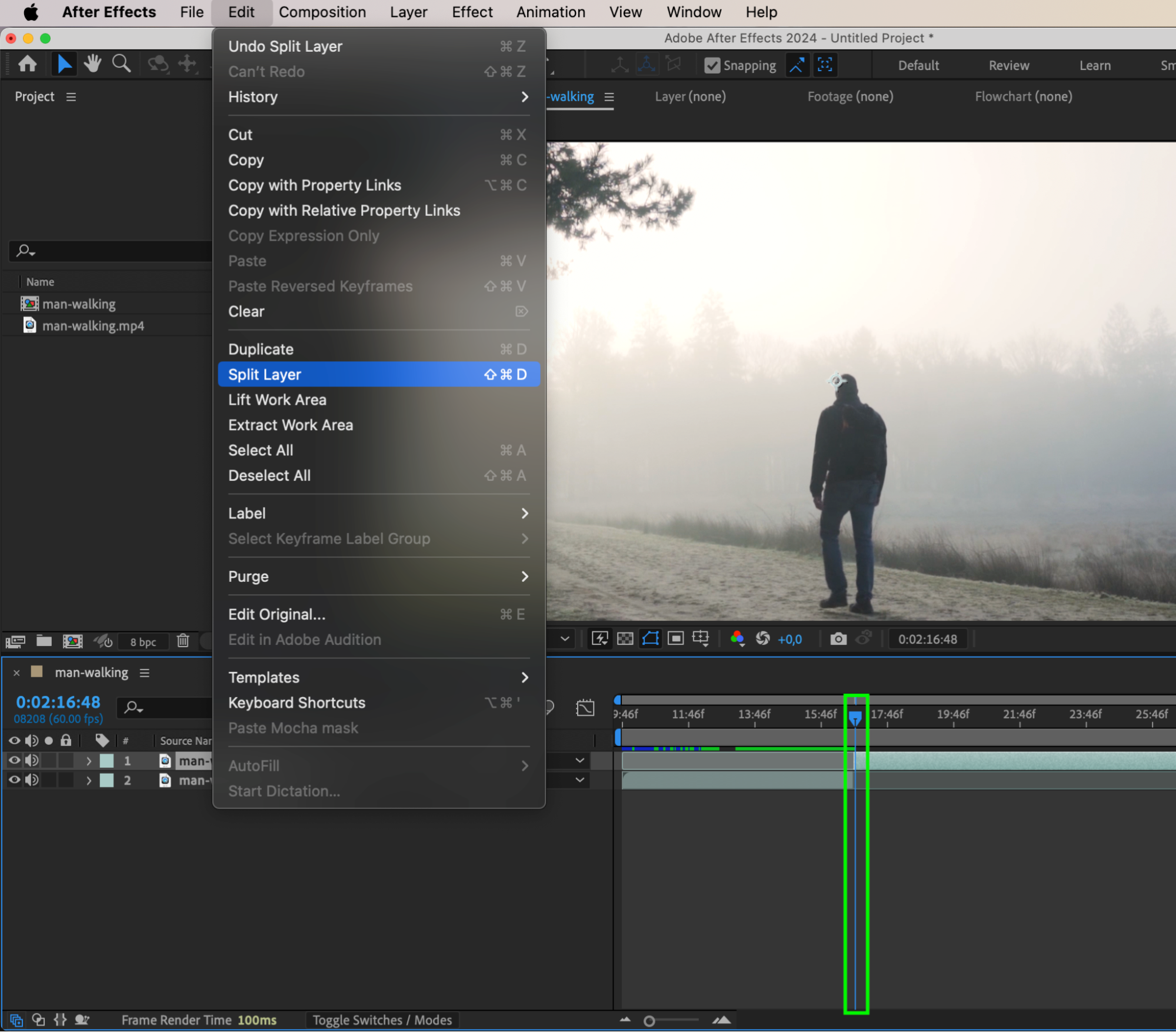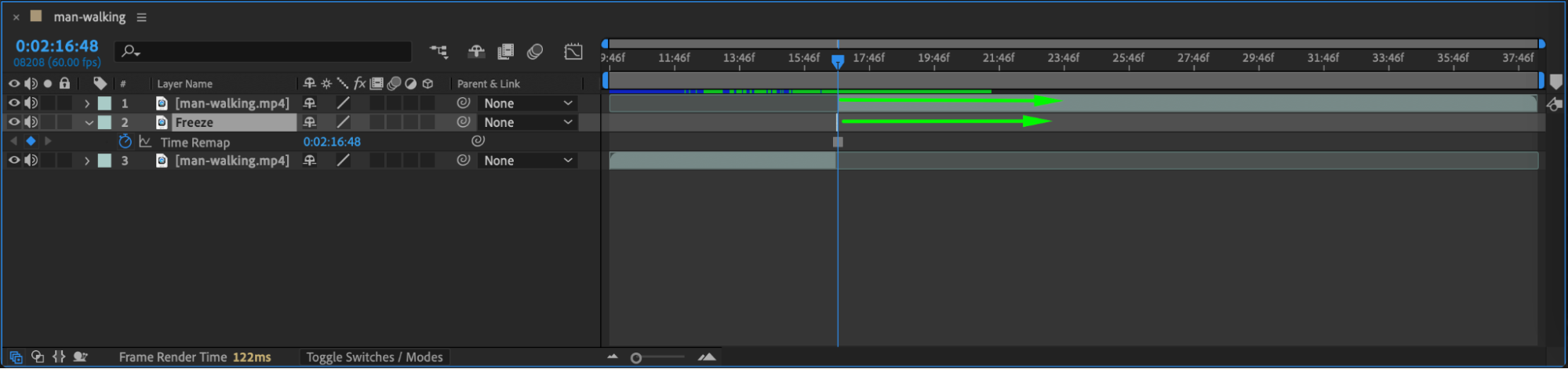 Move the CTI one frame forward using Page Down or by dragging it. Split the layer again at this new frame. Now you’ll have a 1-frame section in the middle between two longer video segments.