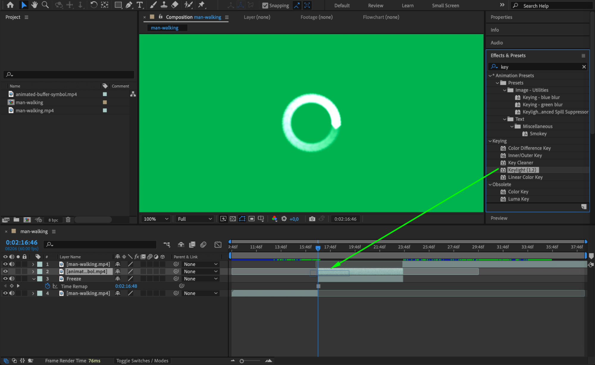 With the buffering symbol layer selected, go to the Effects & Presets panel and search for Keylight (1.2). Apply it, then use the eyedropper to select the green background. The green will be removed, and only the loading symbol will be visible.