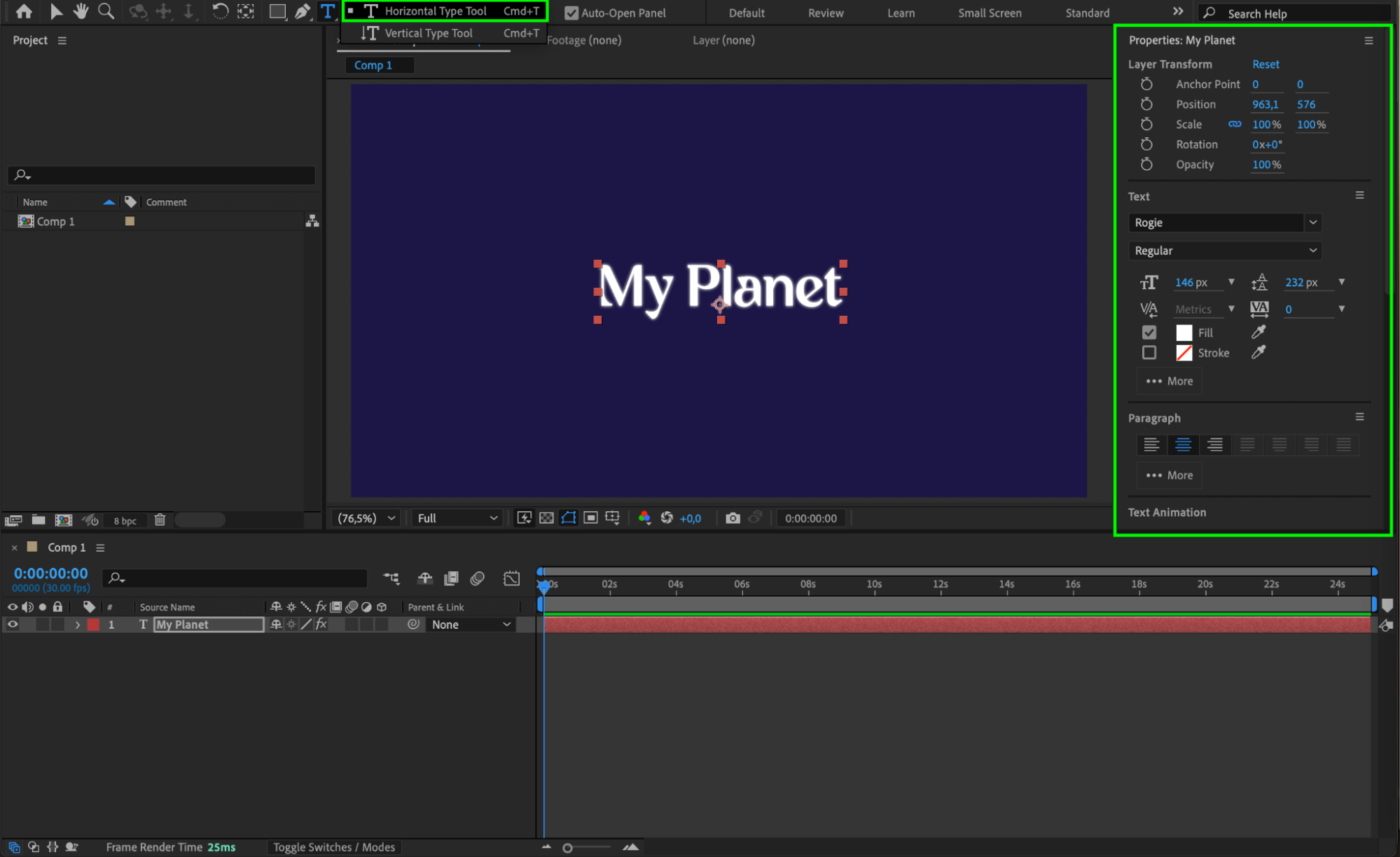 Open your After Effects project and select the Type Tool (Ctrl/Cmd + T). Click anywhere on