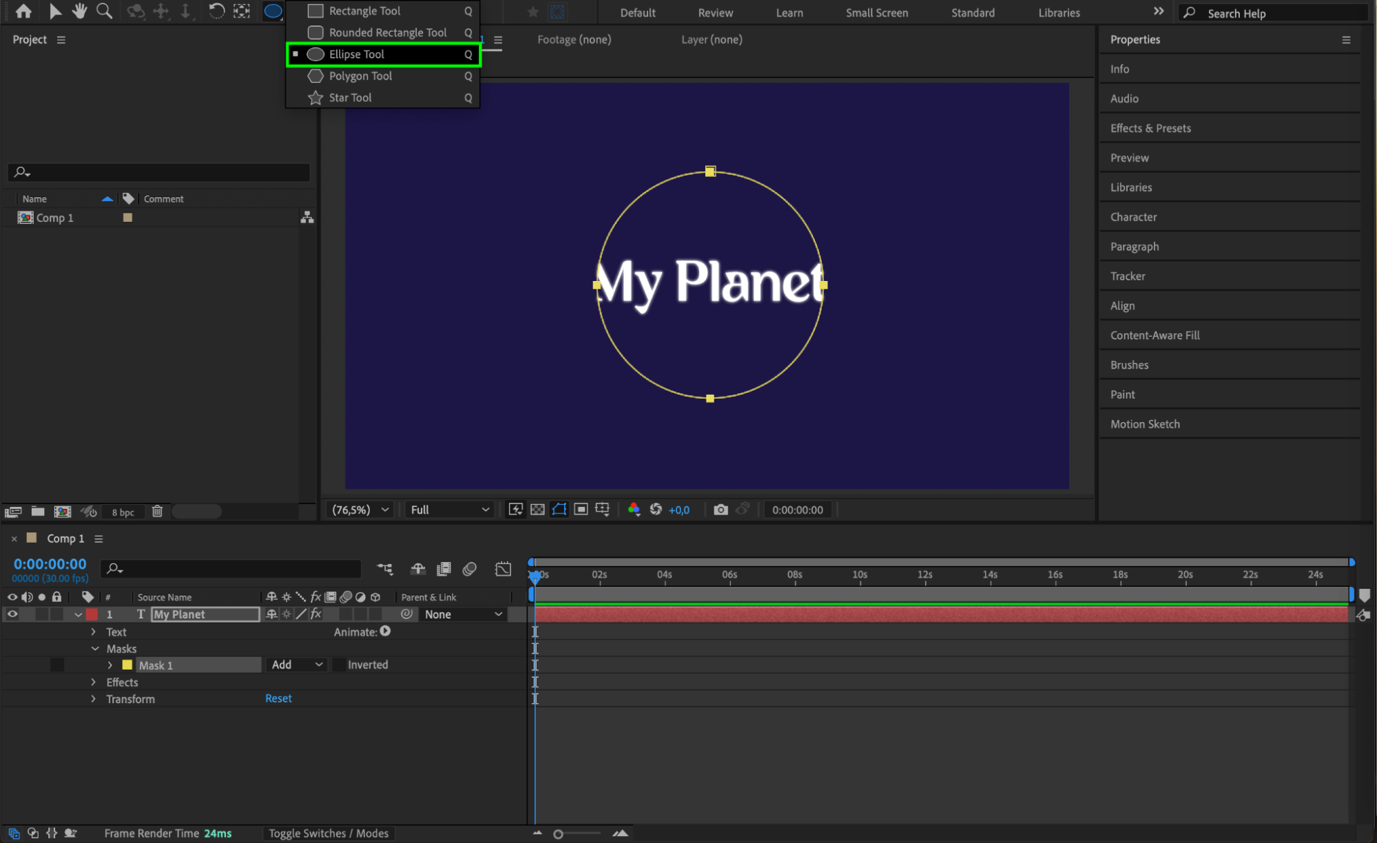 Select the text layer and choose the Ellipse Tool (Q) from the toolbar. Double-click the tool to create a perfect circular mask. This mask will act as a path for the text animation.