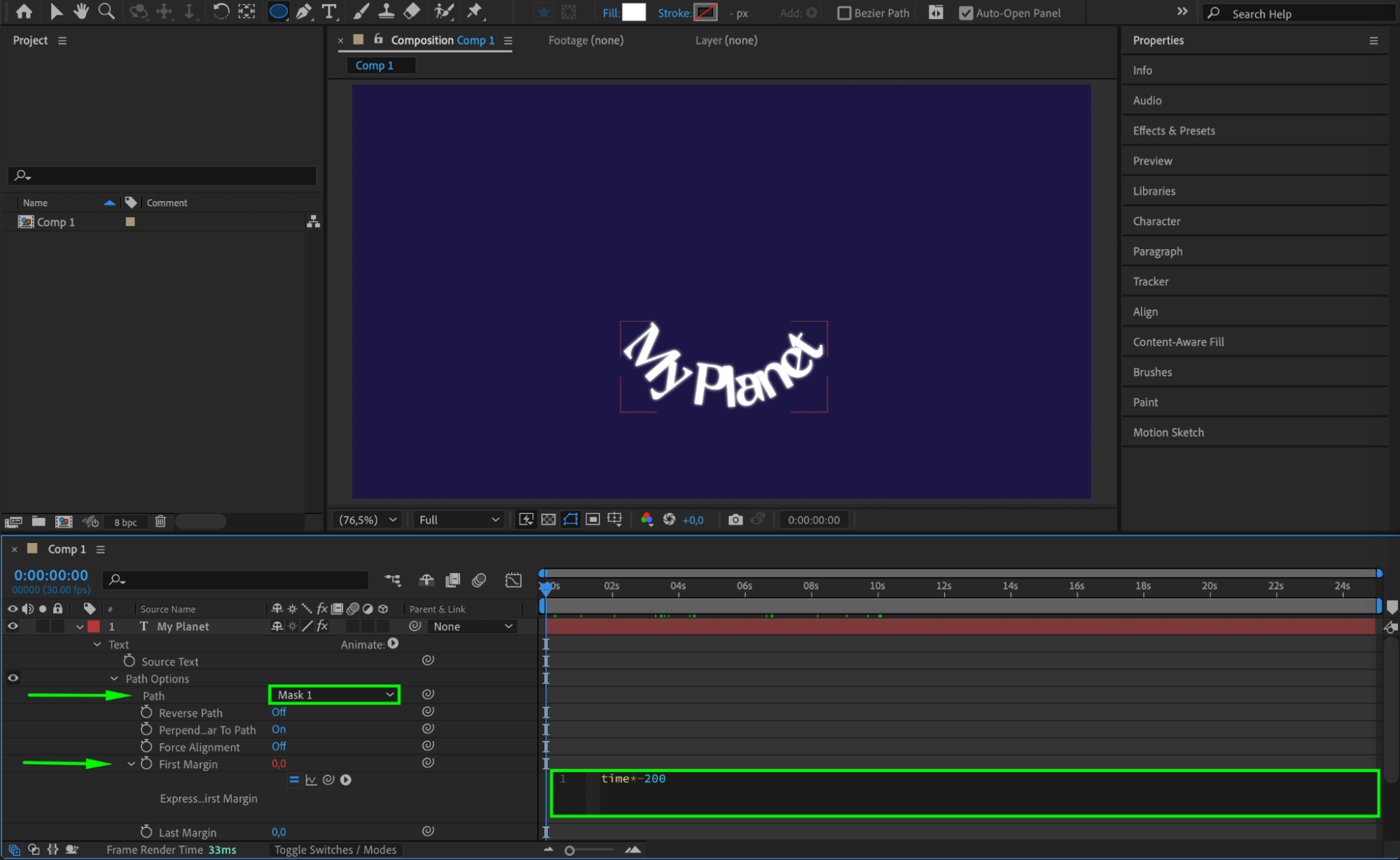 Expand the Text Layer Properties and go to Path Options. Set Path to Mask 1 so that the text follows the circular shape. To make the text animate around the path, hold Alt/Option and click the stopwatch next to First Margin, then enter the expression: