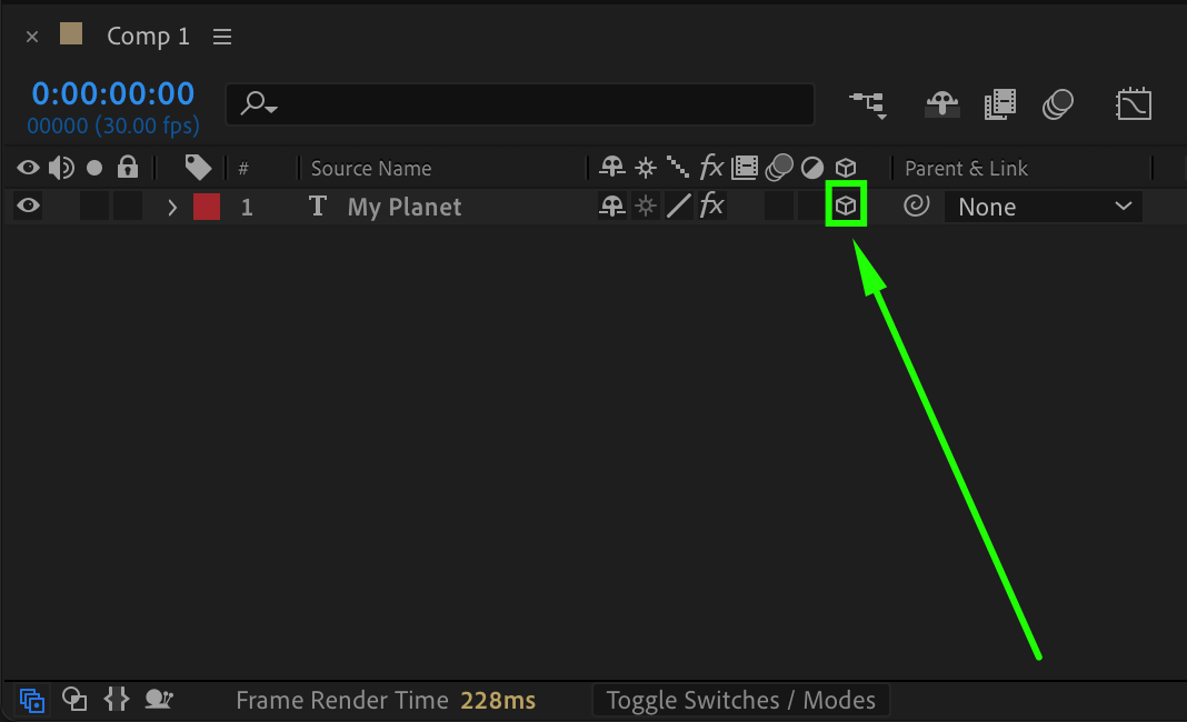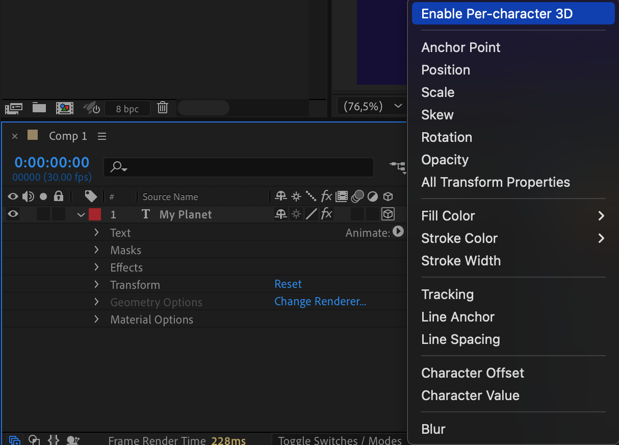 Check the 3D Layer Checkbox for the text layer in the Timeline Panel. This allows you to add depth and rotation to the animation.
