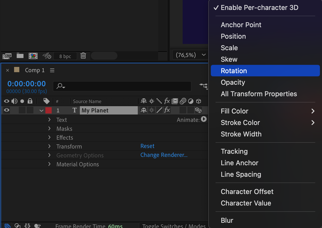 Press the Add button again and choose Rotation. This will allow you to animate the text’s movement in 3D space.