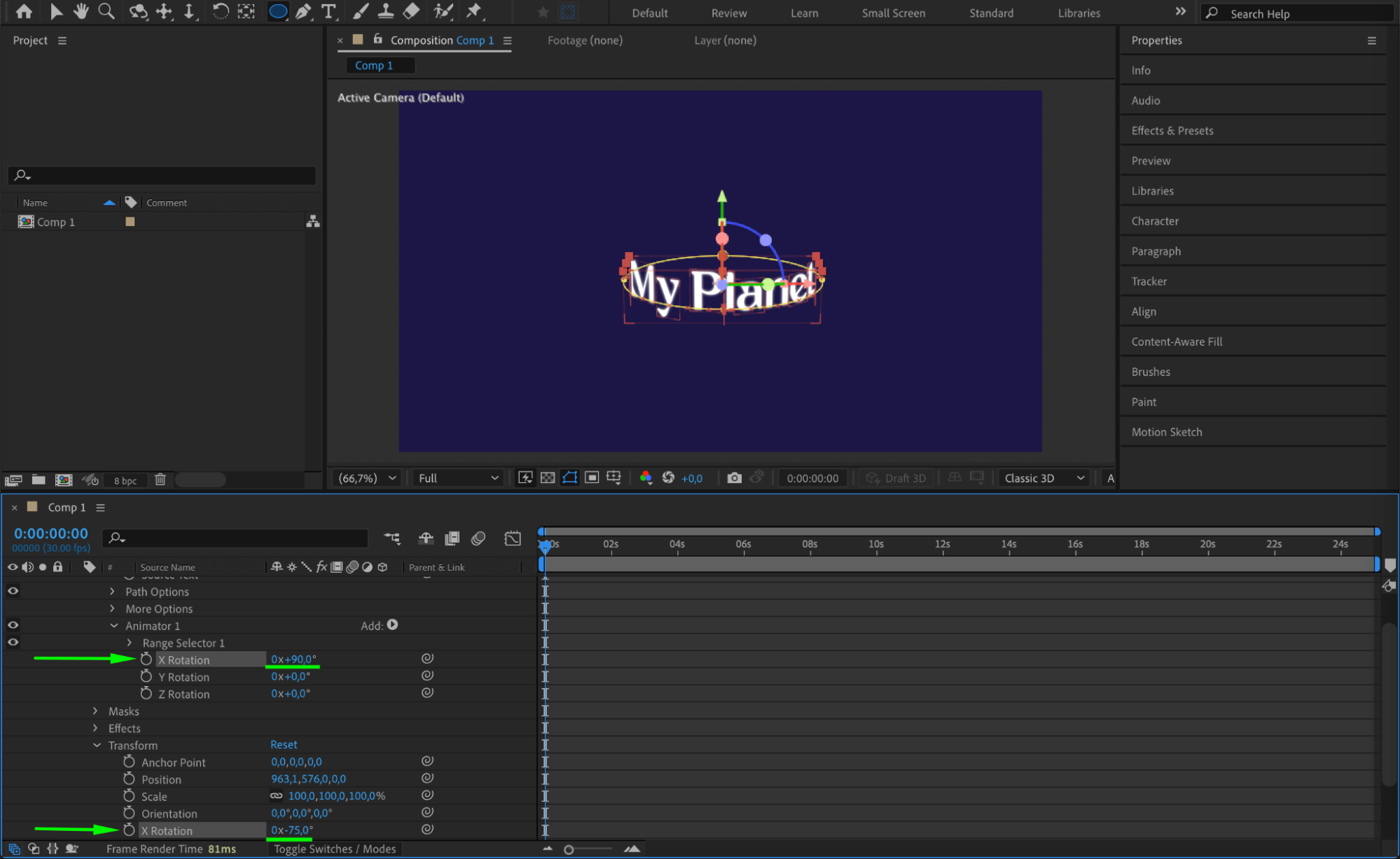 Under Animator 1, set the X Rotation to 90° to tilt the text. Then, adjust the X Rotation of the entire text layer to -75° for a more dynamic perspective.