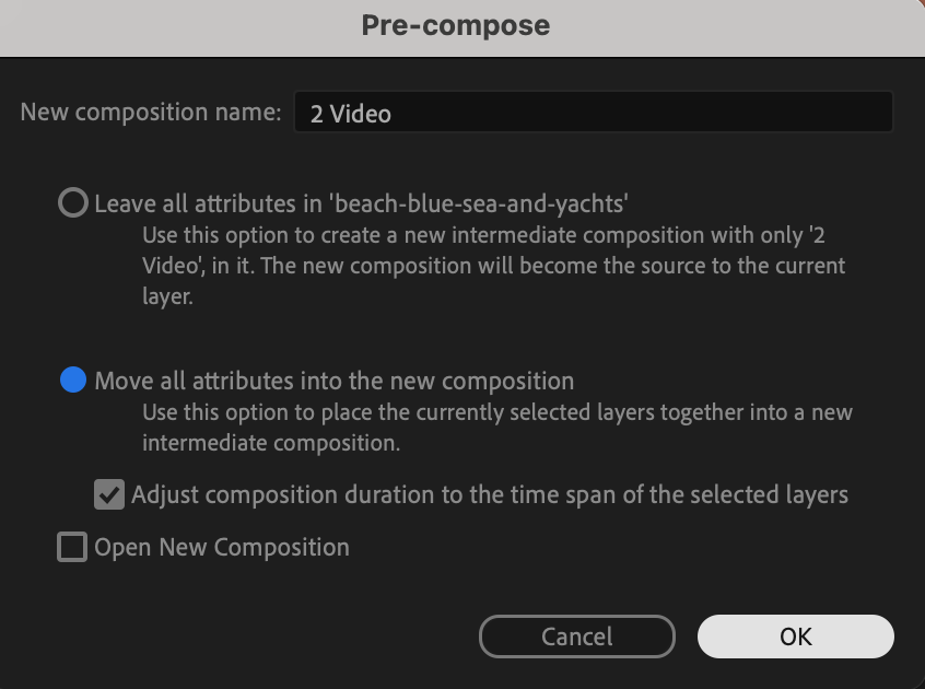 Right-click on the top video layer and select Pre-Compose. If you have changed any properties in the Transform section, such as scale or position, make sure to Move All Attributes into the new composition. This ensures a clean transition without unwanted distortions.