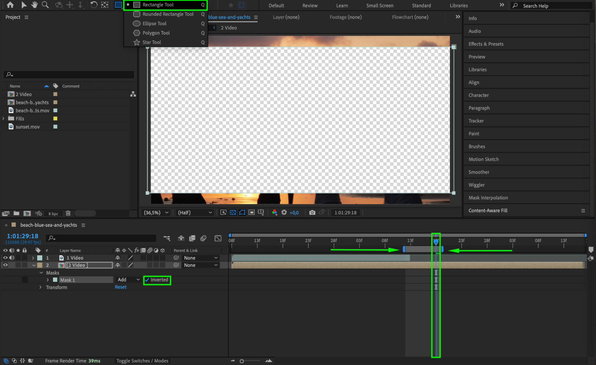 Select the second video layer and move the CTI (Current Time Indicator) to its position. Choose the Rectangle Tool (Q) and create a mask around the area where you want the glitch effect to occur. Then, check the Inverted box next to the mask settings to reveal only the selected portion.