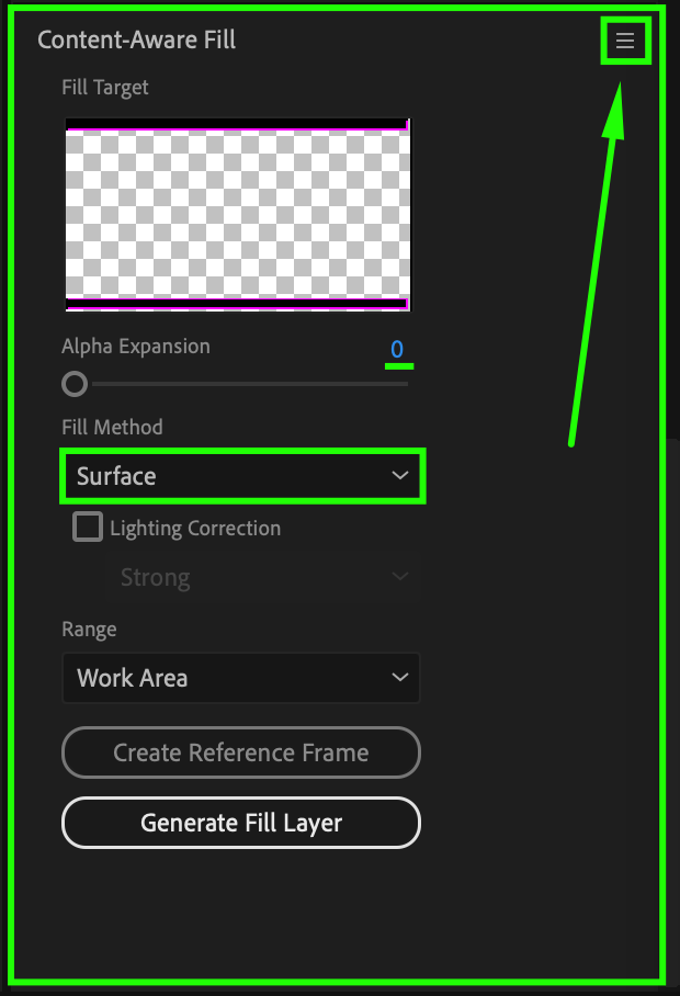 In the Content-Aware Fill panel, set Alpha Expansion to 0 and Fill Method to Surface. Then, click on the three-line menu in the upper-right corner of the panel and select Content-Aware Fill Settings.