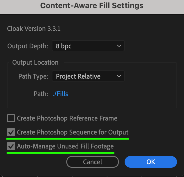 In the Content-Aware Fill Settings window, enable Create Photoshop Sequence for Output and Auto-Manage Unused Fill Footage, then click OK. These settings ensure that the fill process runs smoothly and removes unwanted elements.