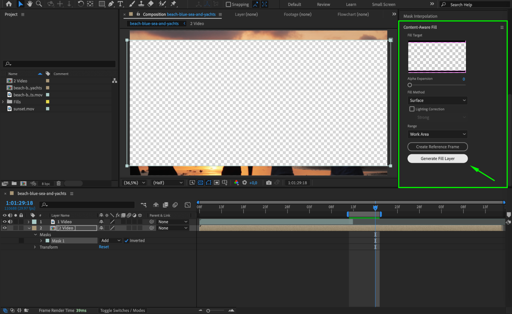 Back in the Content-Aware Fill panel, click Generate Fill Layer to process and apply the effect. After Effects will analyze the footage and fill in the masked area to create a glitchy transition.