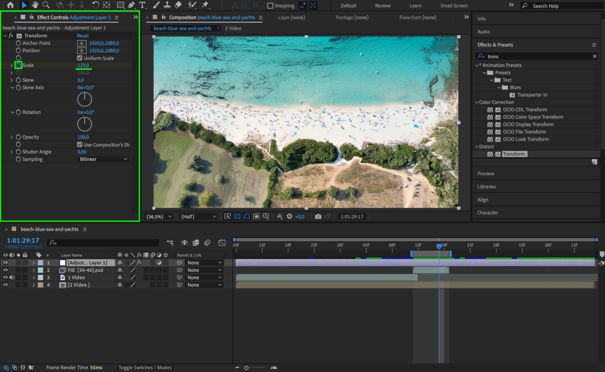 With the adjustment layer selected, go to Effects & Presets, search for Transform, and apply it.