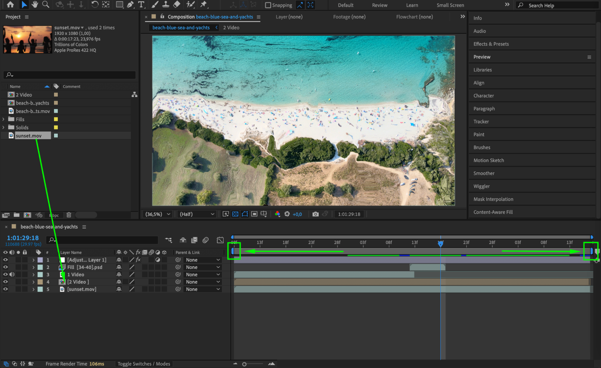 Move the Start and End Comp Sliders back to their original positions. Then, drag the second video from the Project Panel and place it below all layers to finalize the composition.