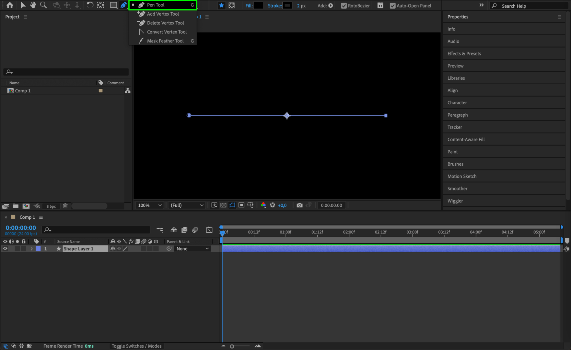 In the composition, select the Pen Tool (shortcut G) from the toolbar. Using the Pen Tool, click once to set the starting point, then click a second time to set the end point. After Effects will automatically draw a line connecting the two points. This line will become the base for your dotted line effect.