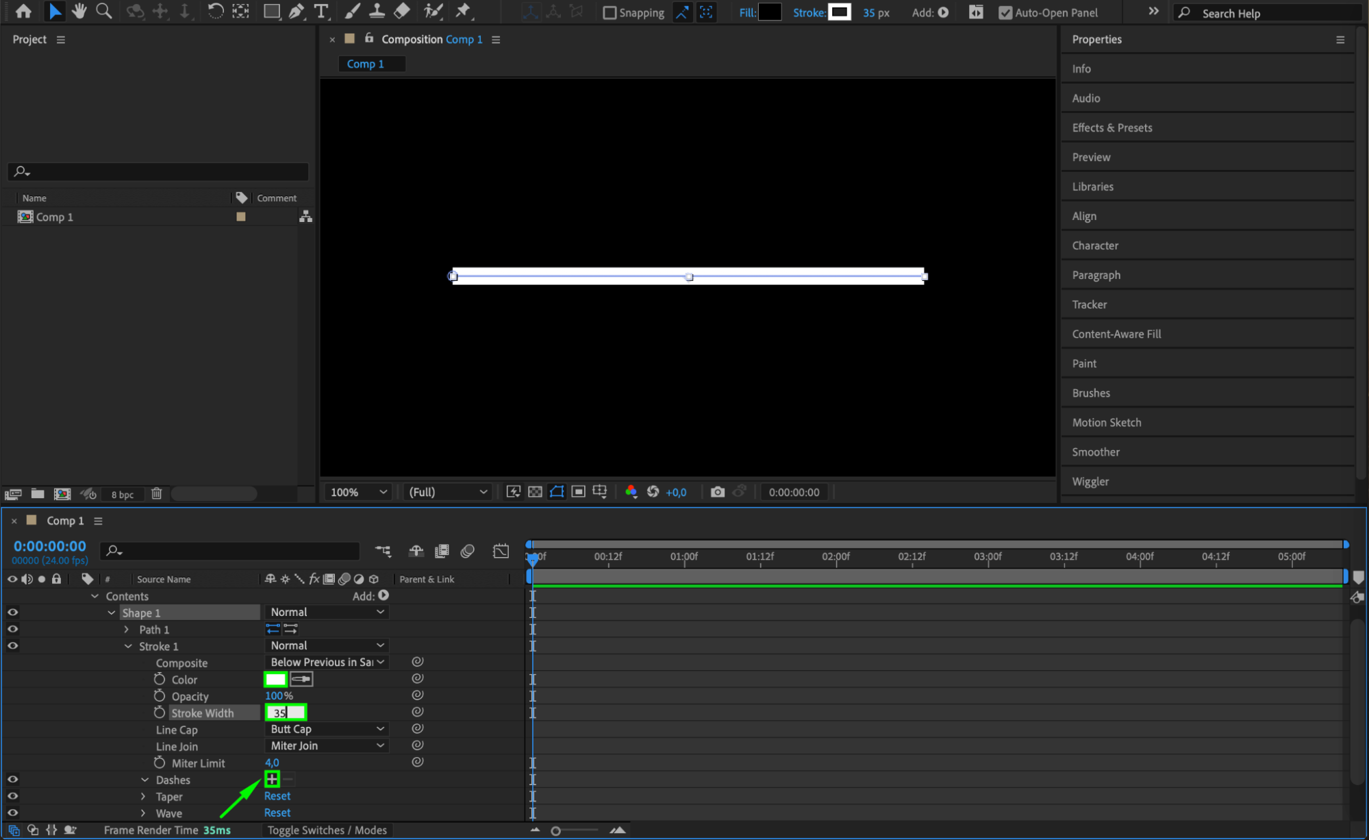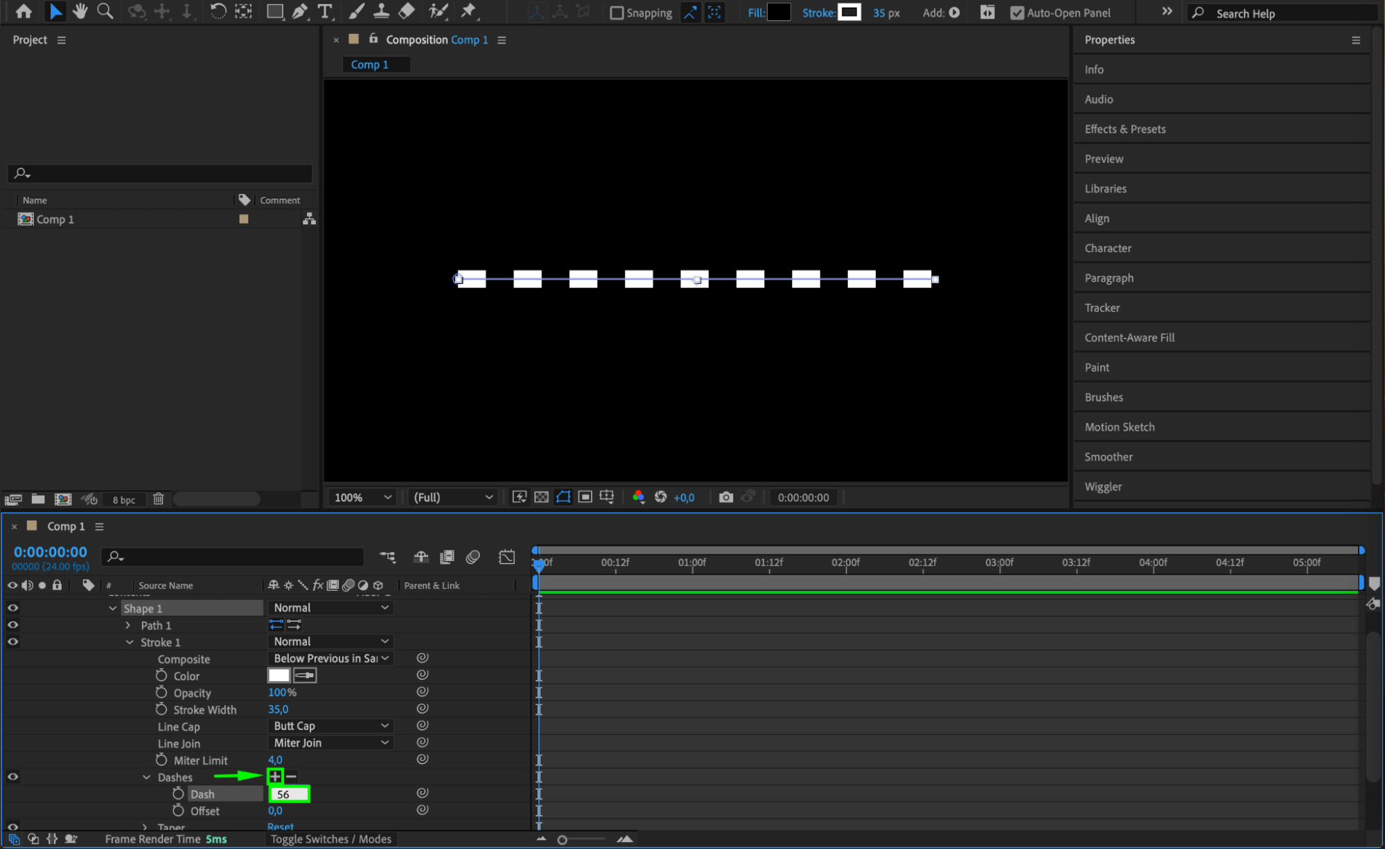 Still in the Timeline panel, expand the properties by navigating to Contents > Shape 1 > Stroke 1. Set the Stroke Color to white or any color you prefer for your dotted line. Then, set the Stroke Width to around 35 (adjust as needed based on your preferences). To make the line dotted, go to the Dashes section under Stroke 1 and click the + icon next to it. This will add the “Dash” property to your line.