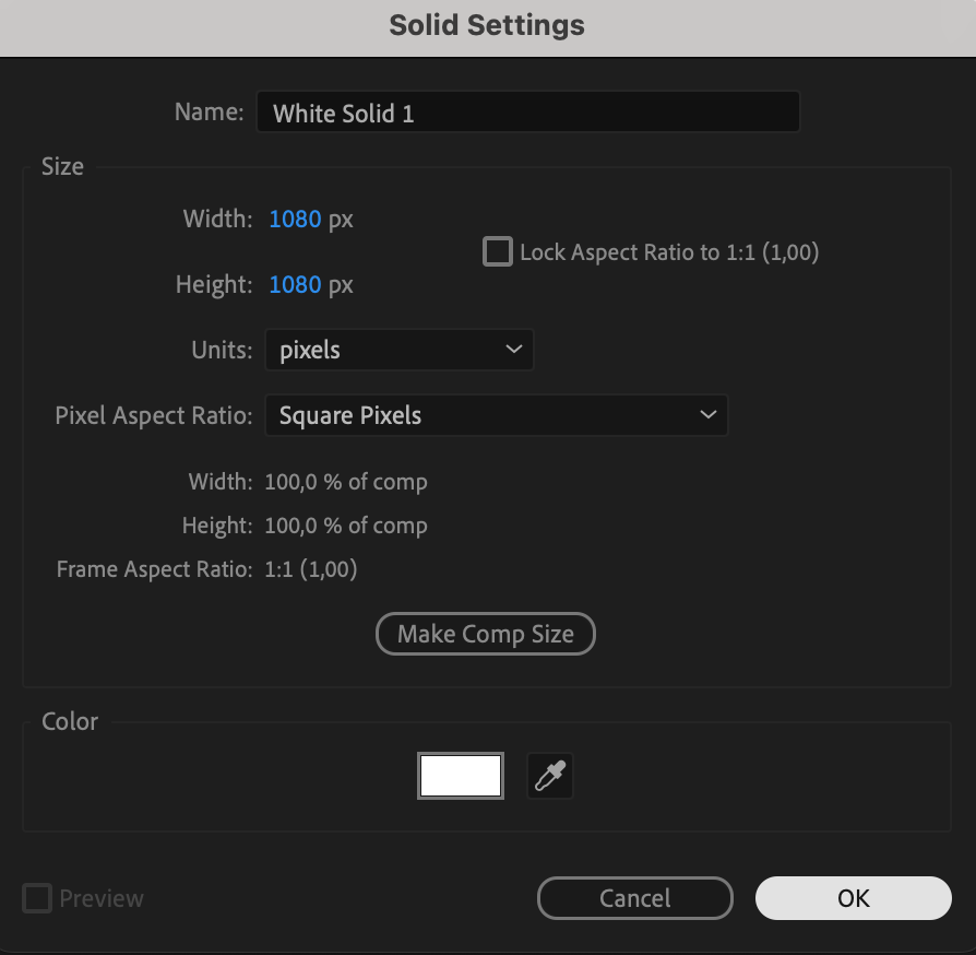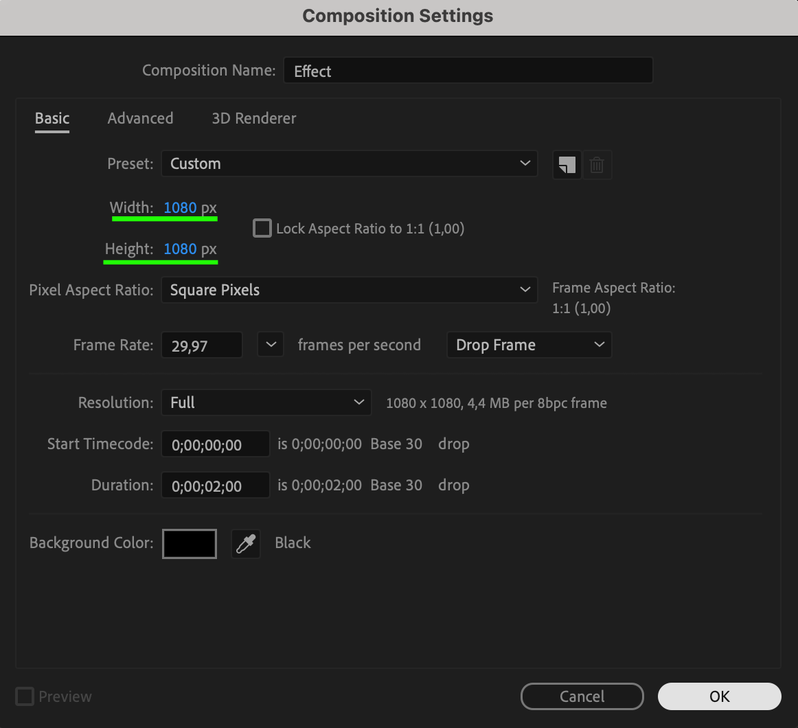 Start by creating a new composition in After Effects. Set the dimensions to 1080×1080 pixels and name it “Effect.” This composition will serve as the base for your force field effect.