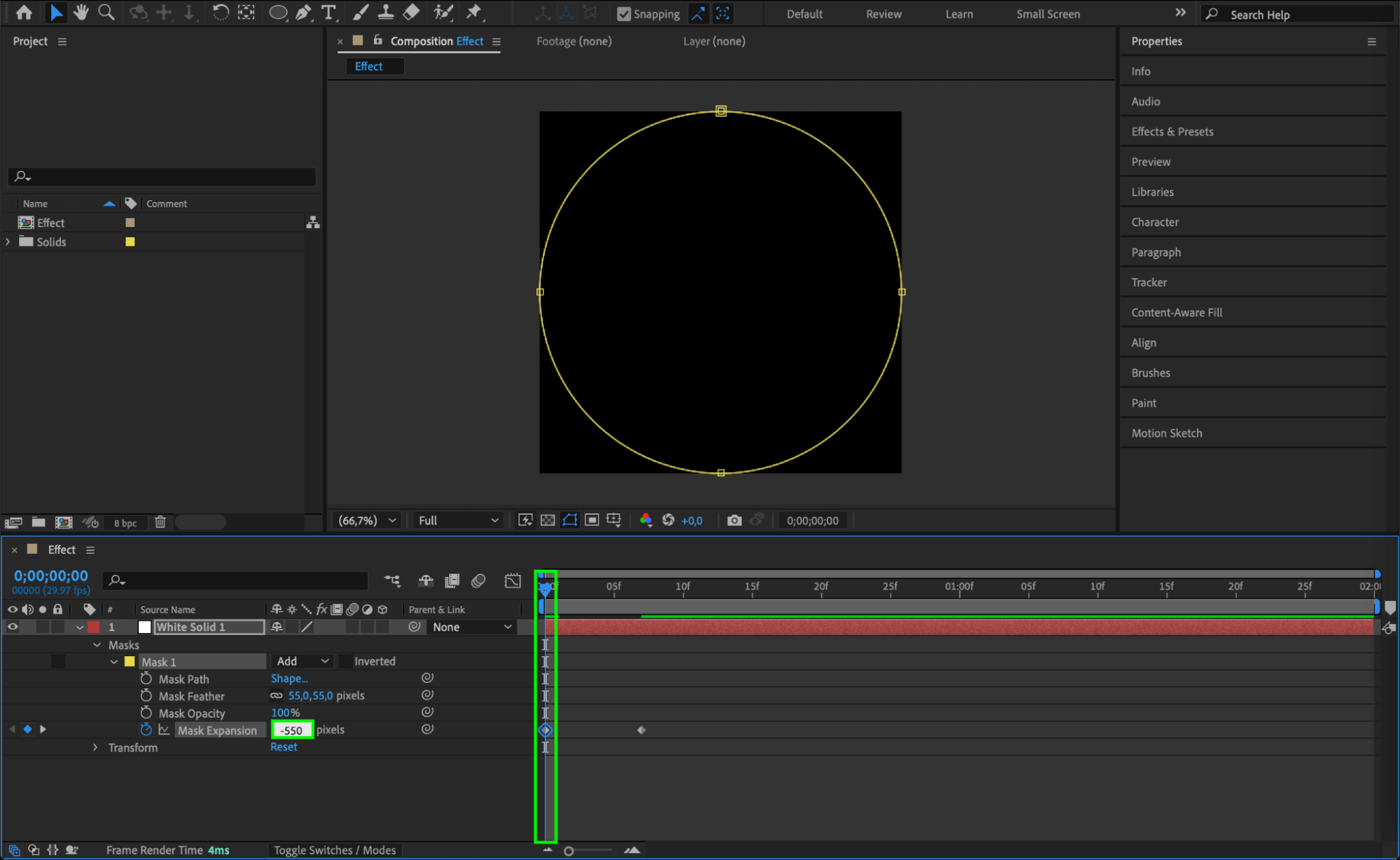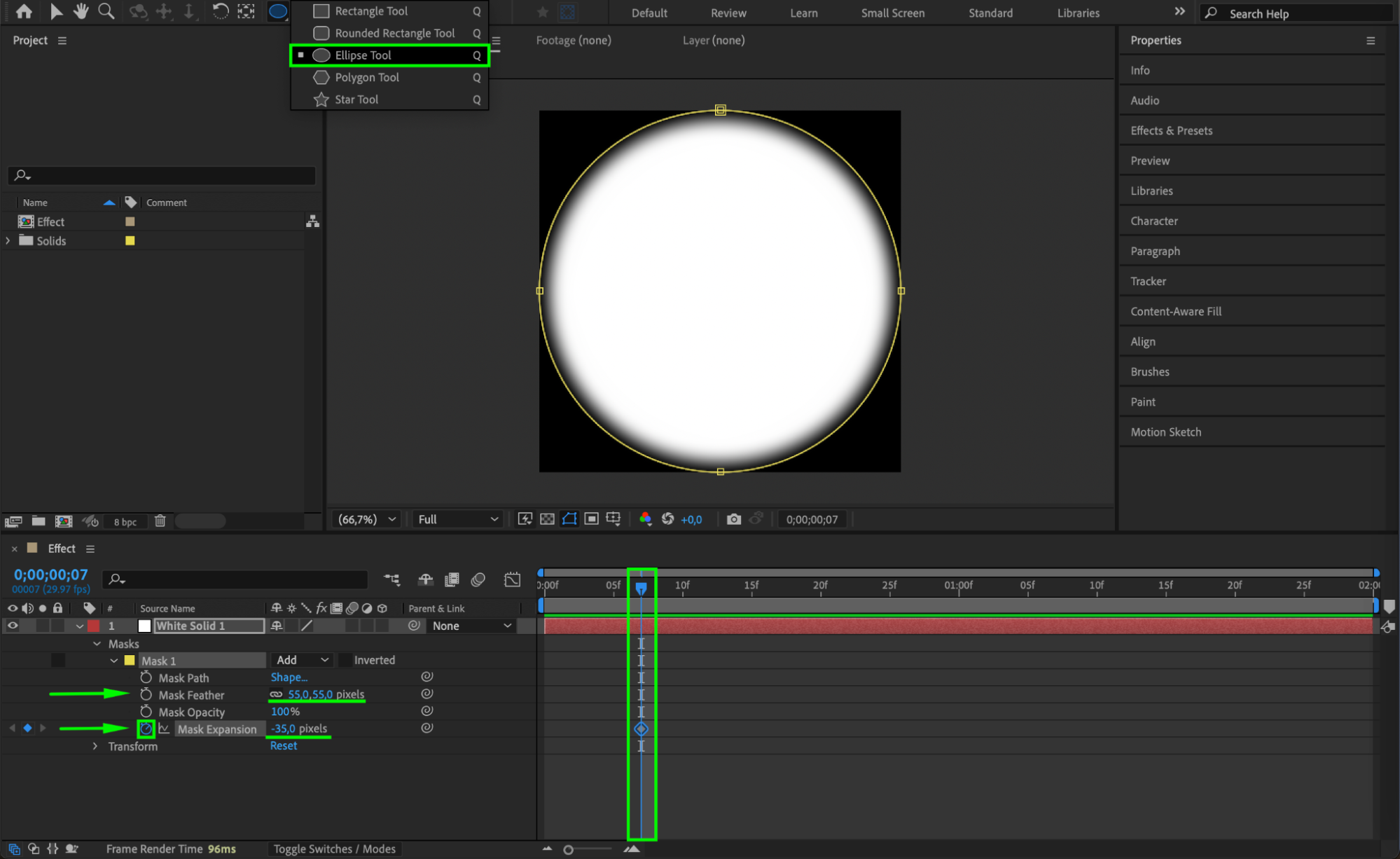 Select the solid layer and double-click on the Ellipse Tool (Q) to create a circular mask. Set the Mask Feather to 55 and the Mask Expansion to -35 after a few frames from the start of the composition. Adjust the Mask Expansion to -550 at the beginning of the composition to achieve the desired effect.