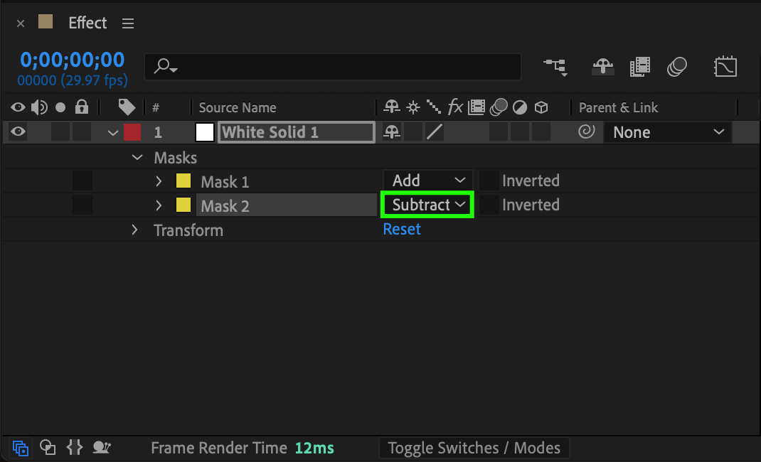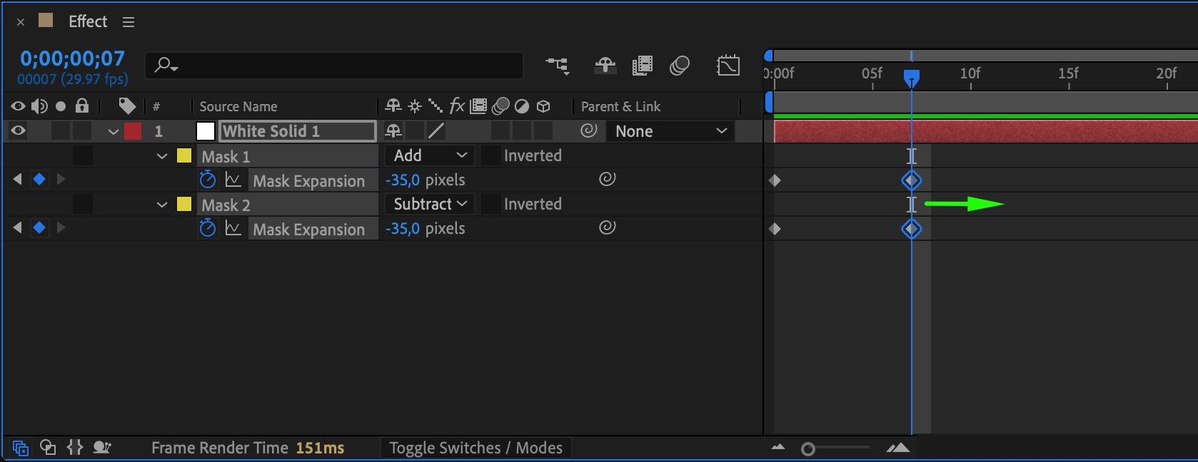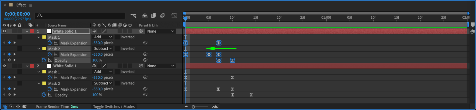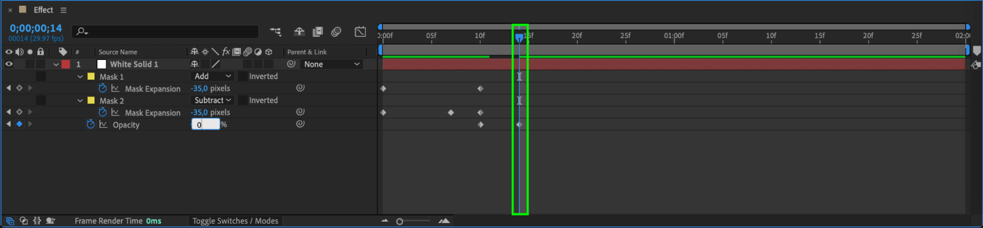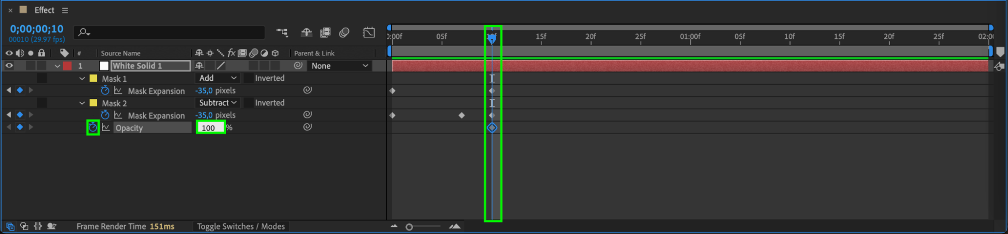 For the solid layer’s Opacity, create a keyframe at 100% opacity at the second keyframe position for both masks. Then, move the CTI (current time indicator) forward a few frames and change the opacity to 0%. This will make the force field fade in and out.