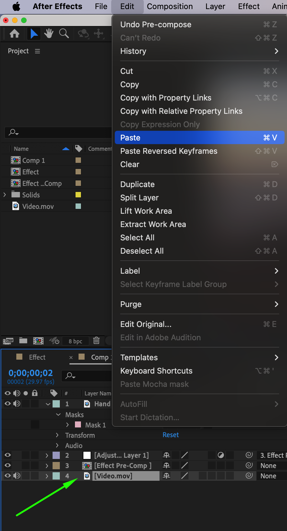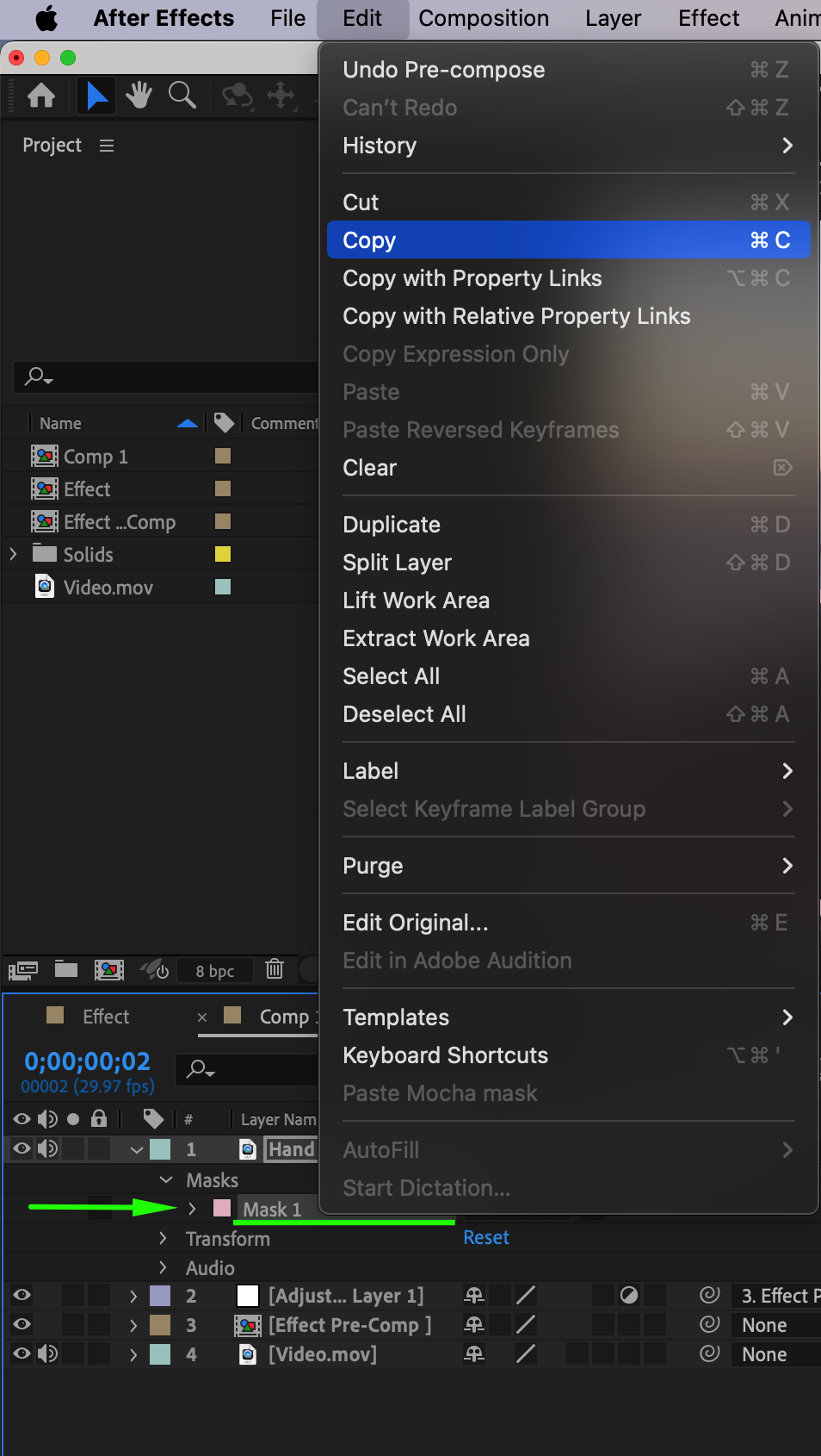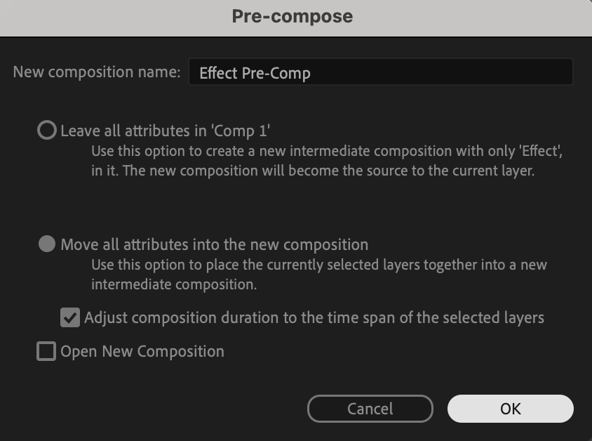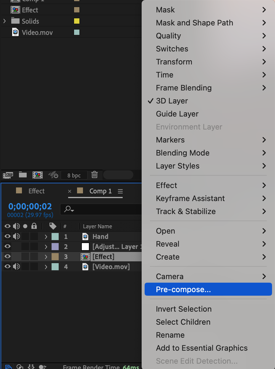 Right-click on the effect layer and choose Pre-compose to lock its position and make it easier to control in the timeline.
