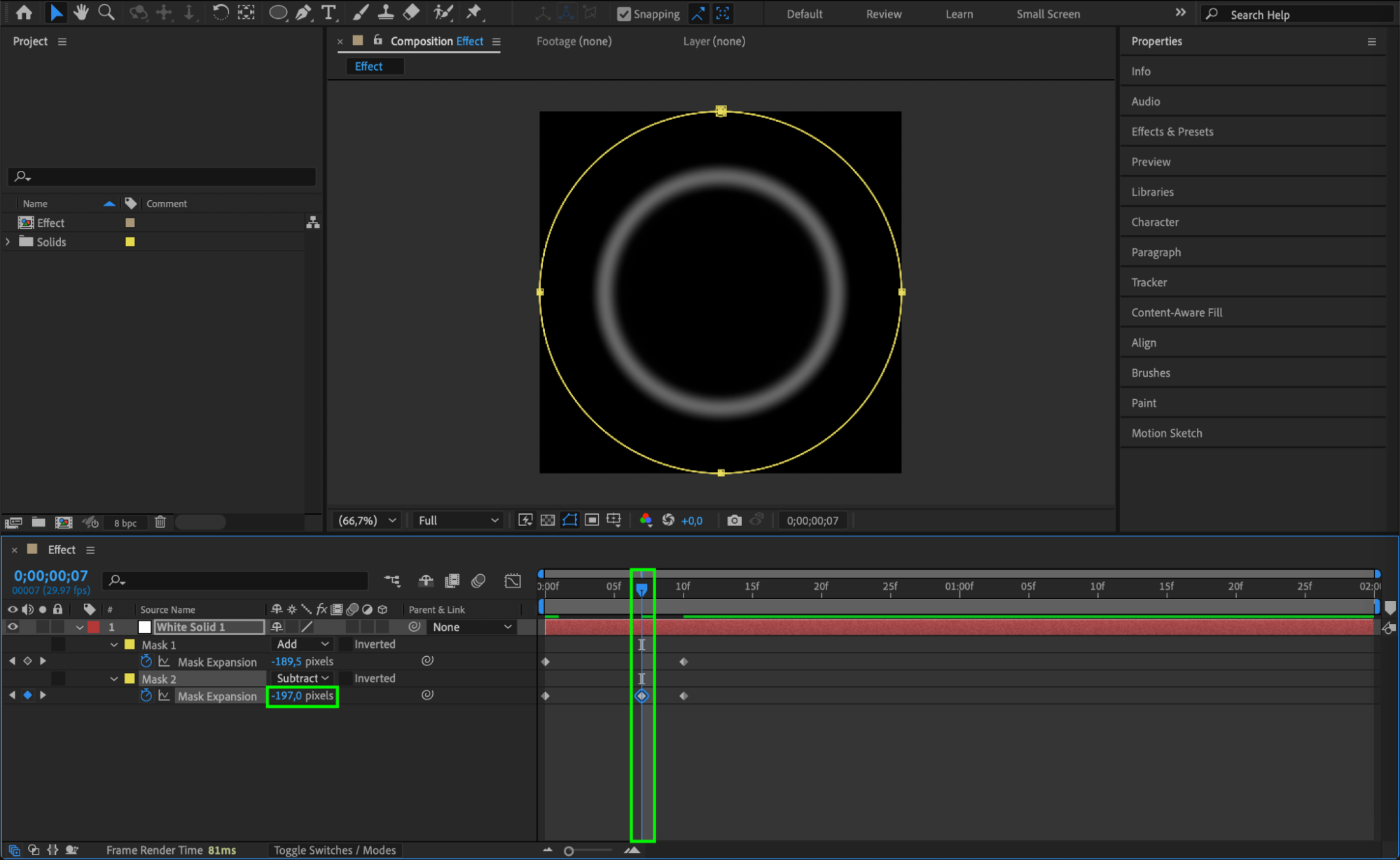 Move the second keyframes for the masks to the right. When the CTI is at their previous position, set the Mask 2 Expansion to -197 to enhance the visual depth of the force field.