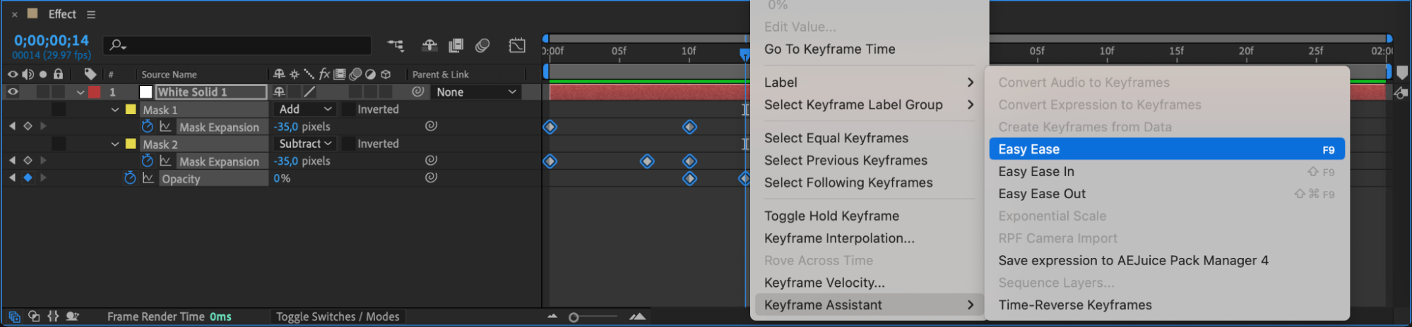 Select the keyframes for both masks and the opacity, then right-click and choose Keyframe Assistant > Easy Ease. This smoothes out the animation for a more natural look.