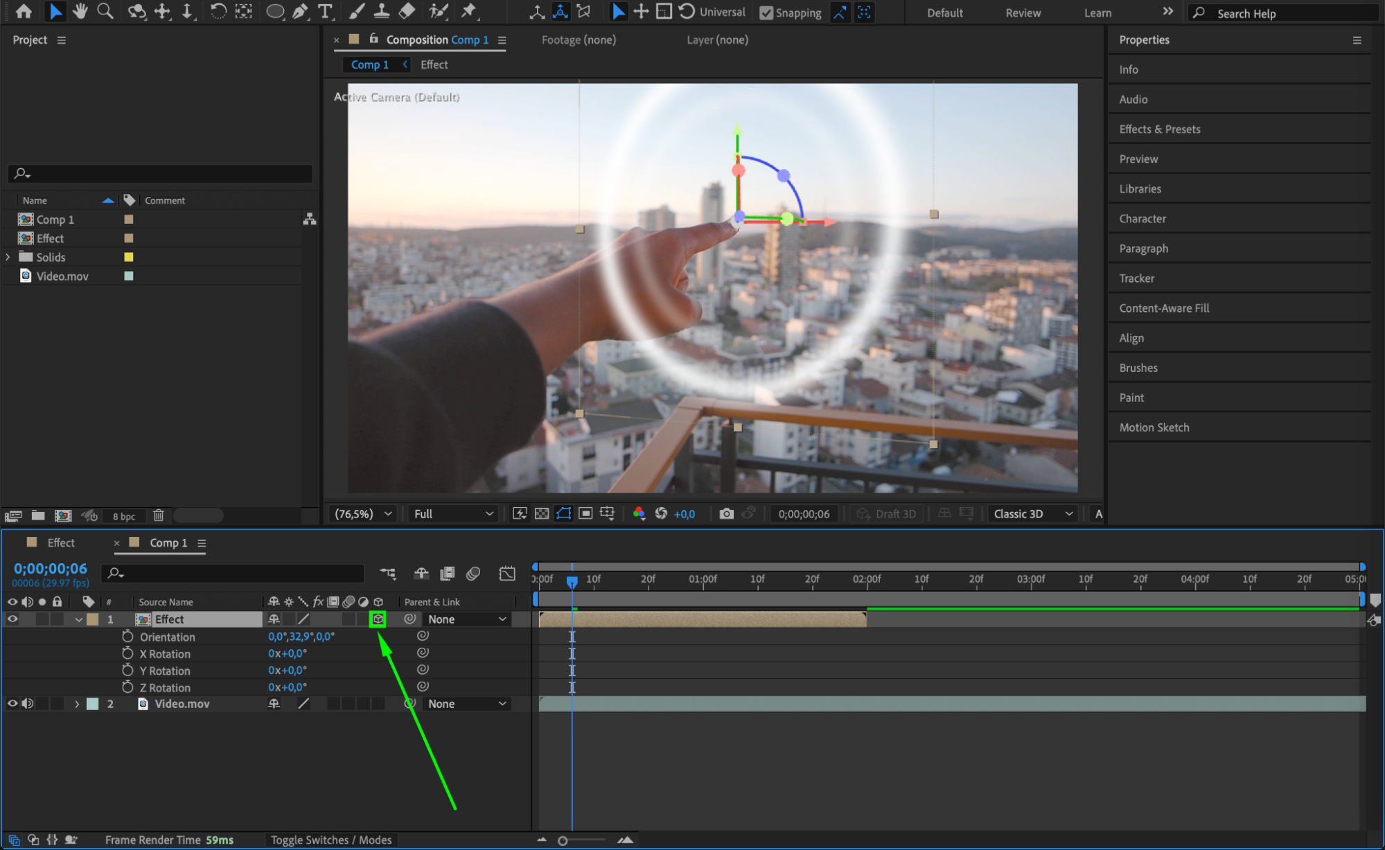 Make the force field layer 3D by clicking the 3D layer checkbox in the timeline. Position it accordingly to match the interaction with the object or person touching the force field.