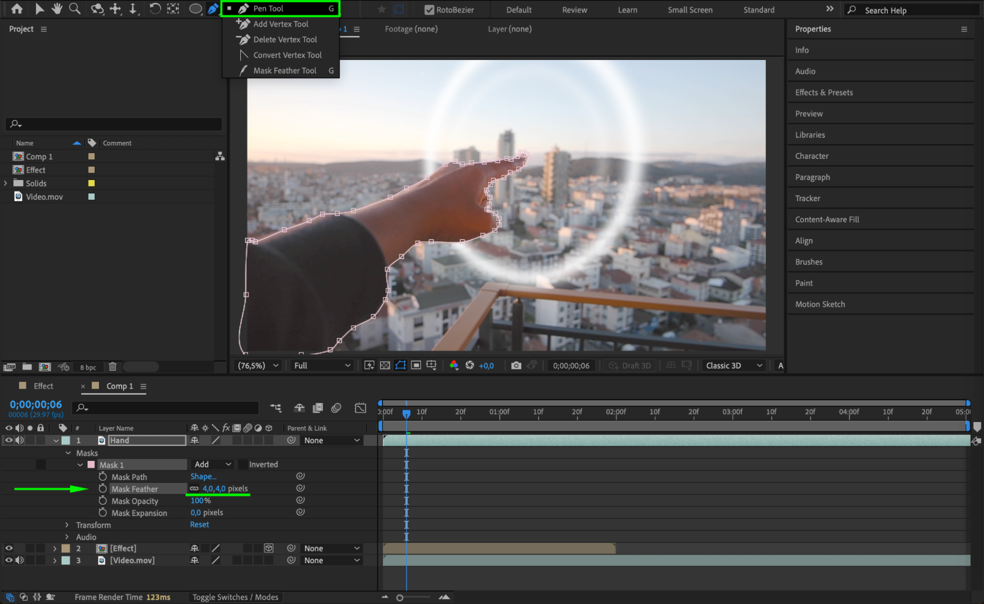 Duplicate the video layer and place it above the original. Use the Pen Tool (G) to create a mask around the hand interacting with the force field. Set the Mask Feather to 4 to blend the edges smoothly.