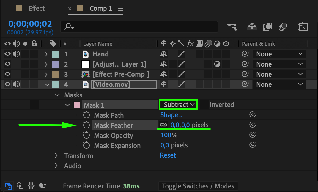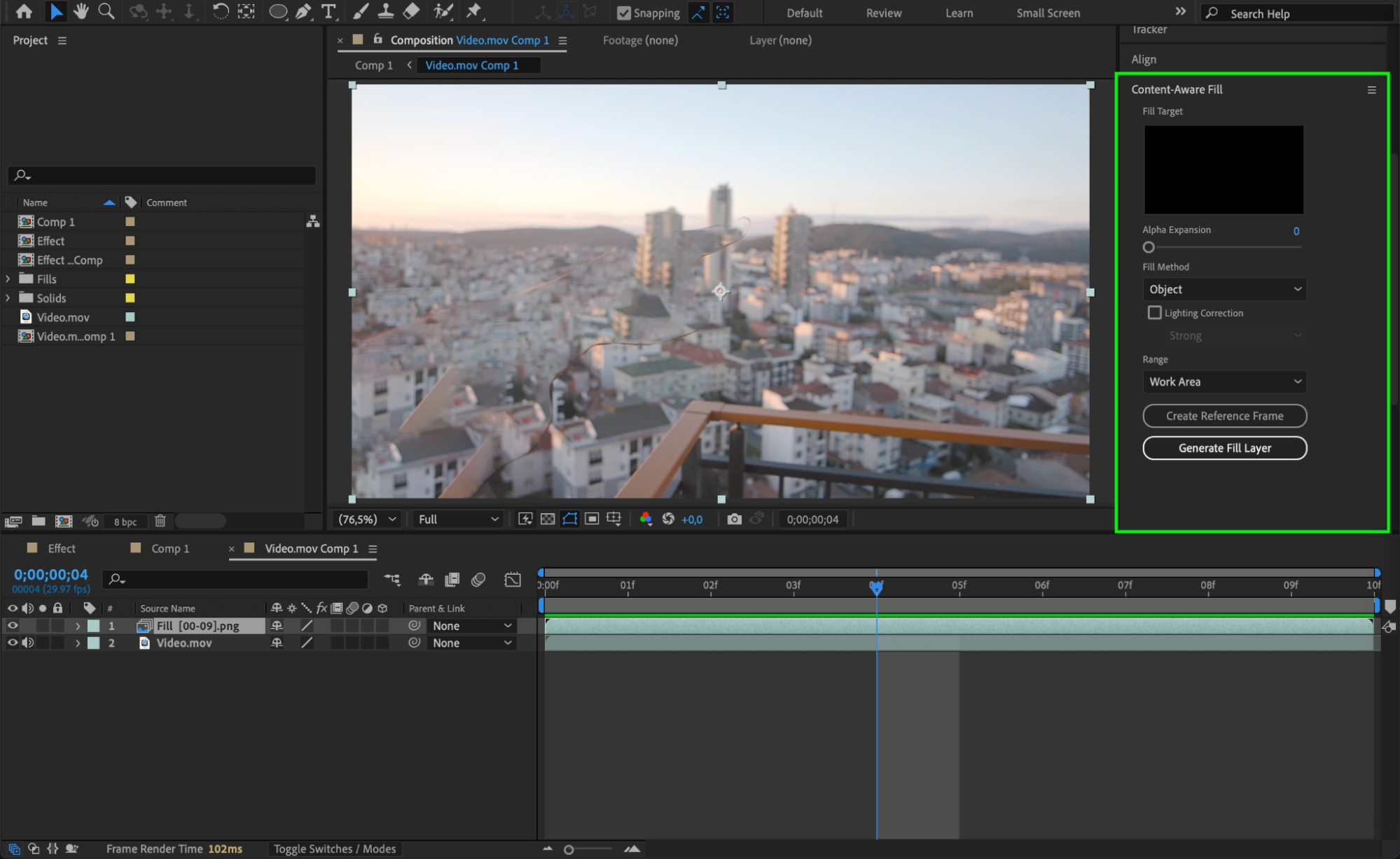 Copy the mask from the hand layer and paste it into the original video layer on the timeline. Change the mask mode to Subtract, set the Mask Feather to 0, and pre-compose the layer. Use Content-Aware Fill to clean up the background, making the force field look seamless