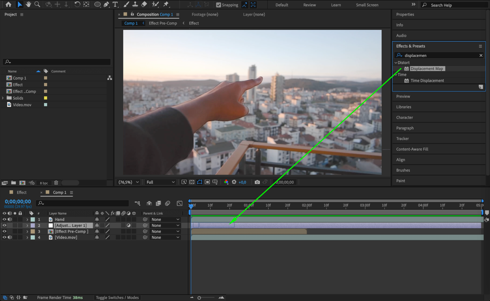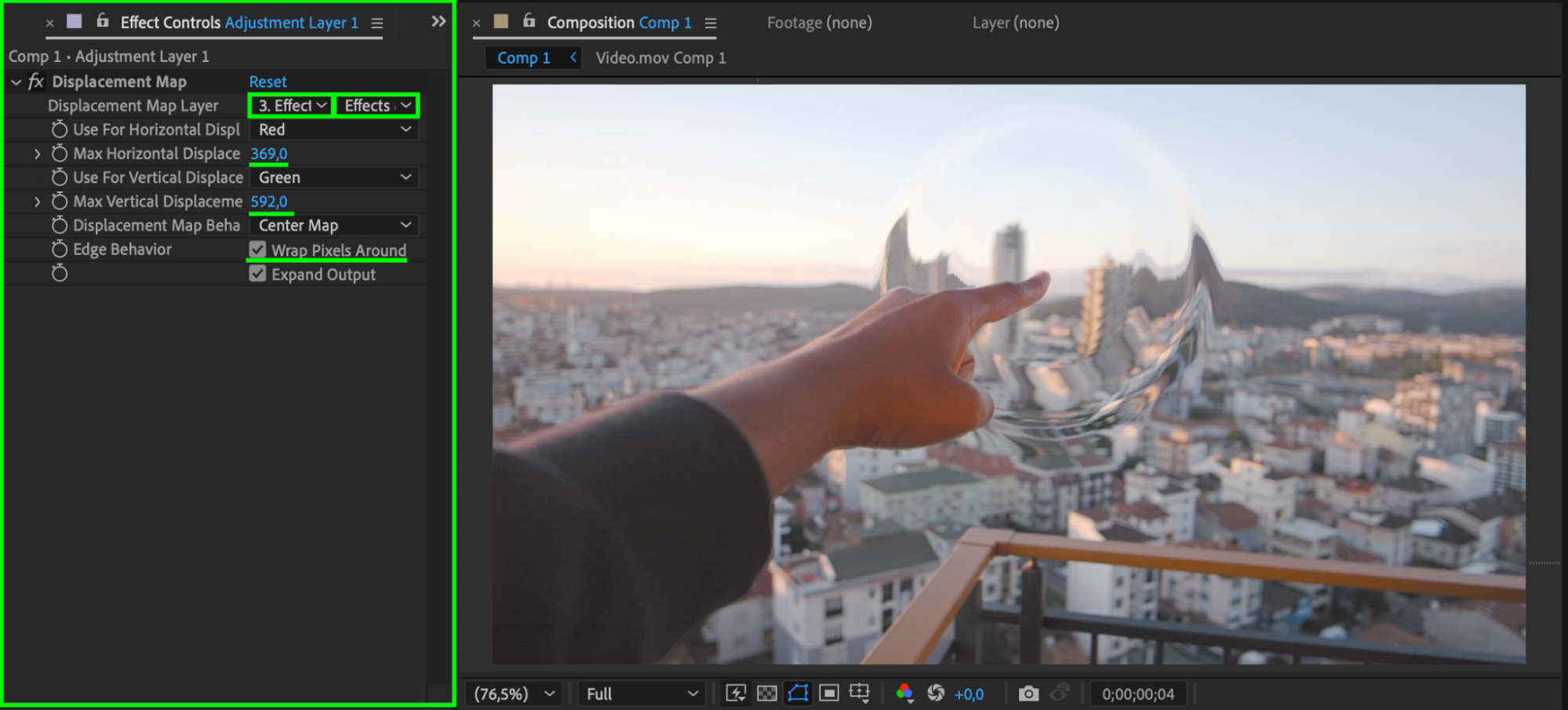 Select the adjustment layer and apply the Displacement Map effect from the Effects & Presets panel. Choose the force field effect layer as the displacement map source. Set the Max Horizontal Displacement and Max Vertical Displacement to create a more intense interaction. Enable Wrap Pixels Around to ensure the effect seamlessly covers the entire area.