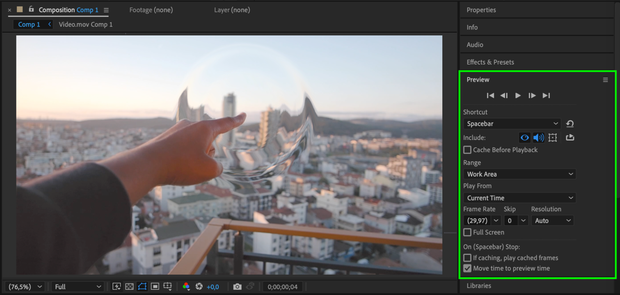 Press the spacebar to preview the animation. Make sure the force field interacts naturally with the hand and blends well with the video content. Adjust keyframes and effects as needed for a polished look.