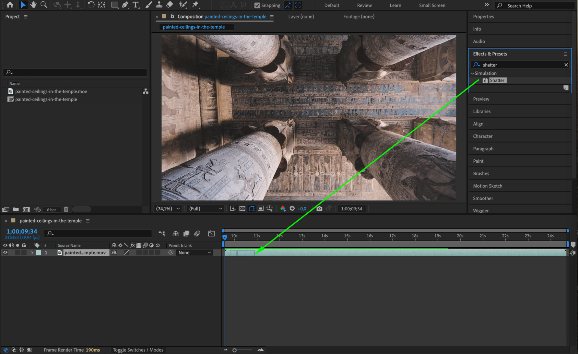 Select the video layer in the timeline. Go to the Effects & Presets panel, search for the Shatter effect, and drag it onto the layer. The Shatter effect is a built-in tool in After Effects that simulates breaking or shattering objects.
