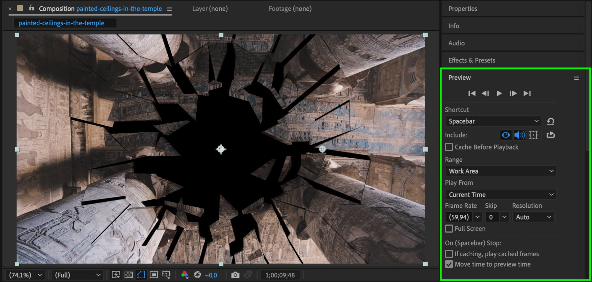 Press the spacebar to preview the composition. Observe the glass break effect and ensure the animation flows smoothly. Adjust the timing or radius values as needed to fine-tune the result.