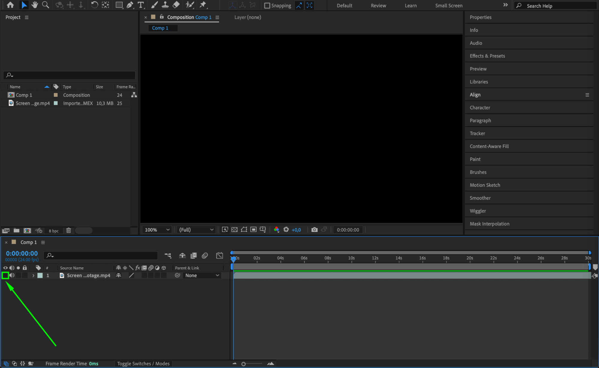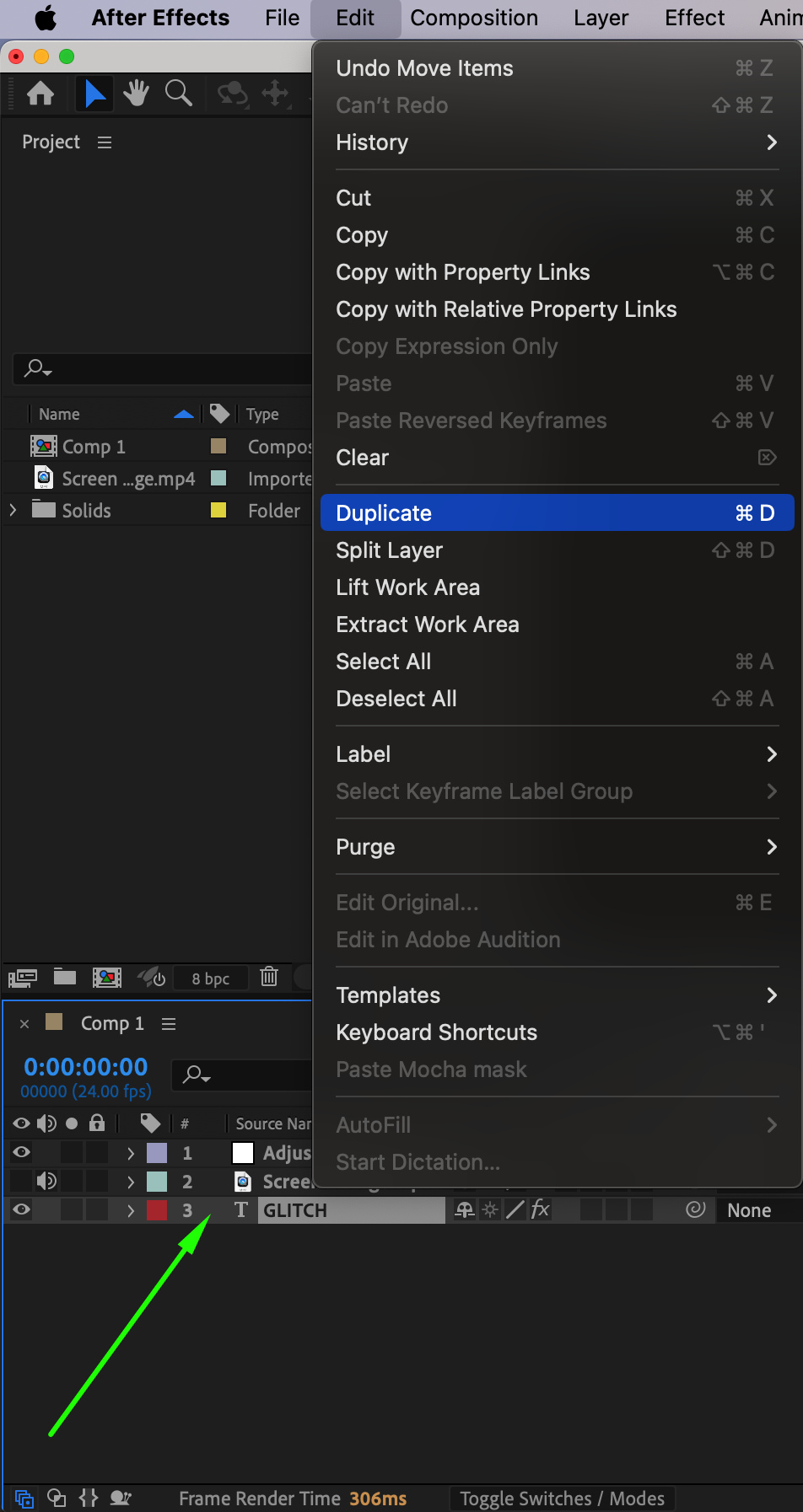 Find and download free glitch stock footage from the internet, such as “Screen Glitch – Free Stock Footage.” This footage will simulate the glitch animation that enhances your effect. Import this footage into After Effects by going to File > Import > File and then drag it onto the timeline. To make it invisible in the composition, click the eye icon next to the layer on the timeline.