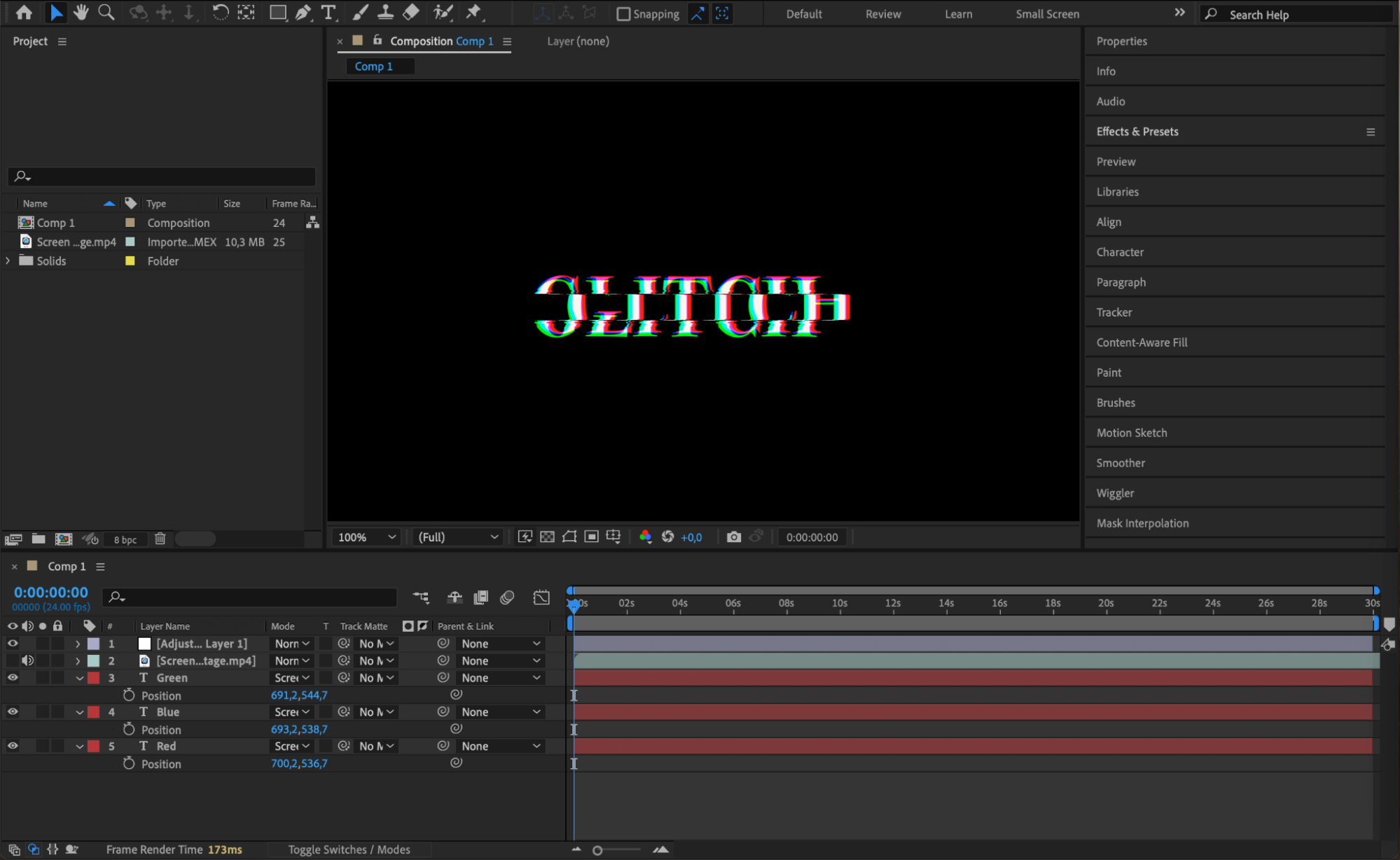 Select all the text layers and press P to reveal the Position property. Slightly offset the position values of each layer to create a misalignment between the colors, enhancing the glitch effect. Experiment with the values until you achieve the desired result.