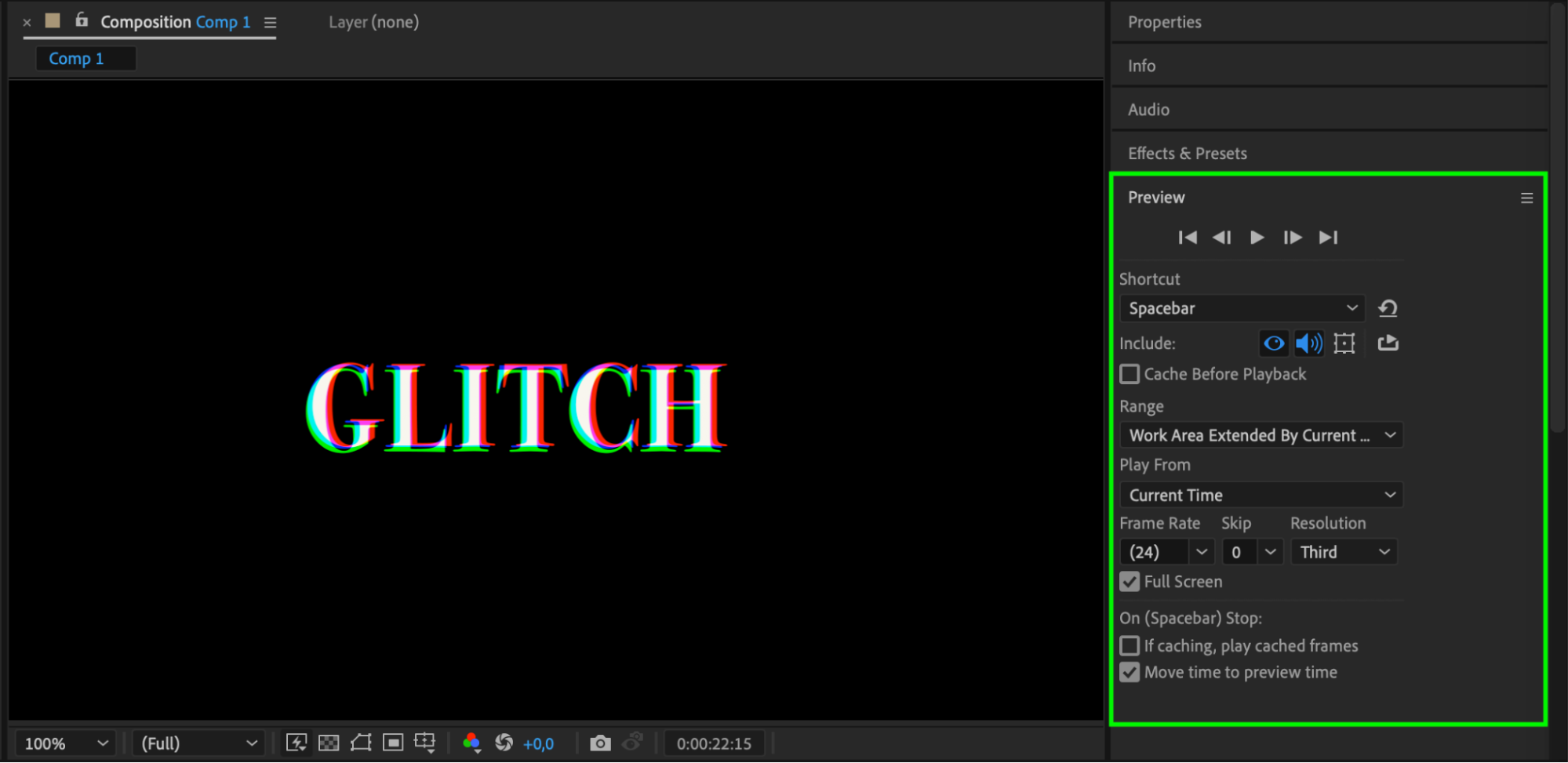 Preview your composition by pressing the Spacebar to play it. Make any necessary adjustments to the effects or positions to ensure the glitch effect looks just right. Tweak the parameters and try different settings to perfect your design.