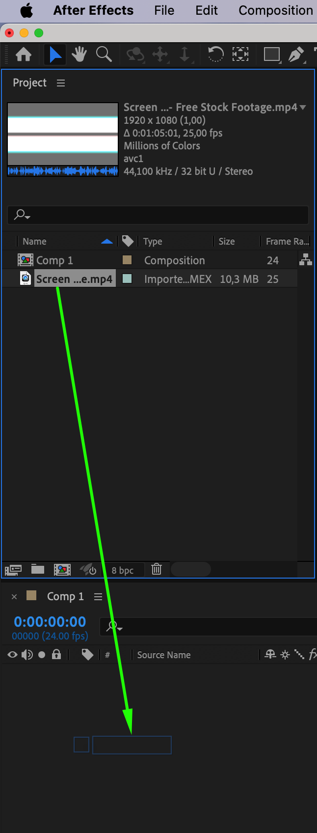 Find and download free glitch stock footage from the internet, such as “Screen Glitch – Free Stock Footage.” This footage will simulate the glitch animation that enhances your effect. Import this footage into After Effects by going to File > Import > File and then drag it onto the timeline. To make it invisible in the composition, click the eye icon next to the layer on the timeline.
