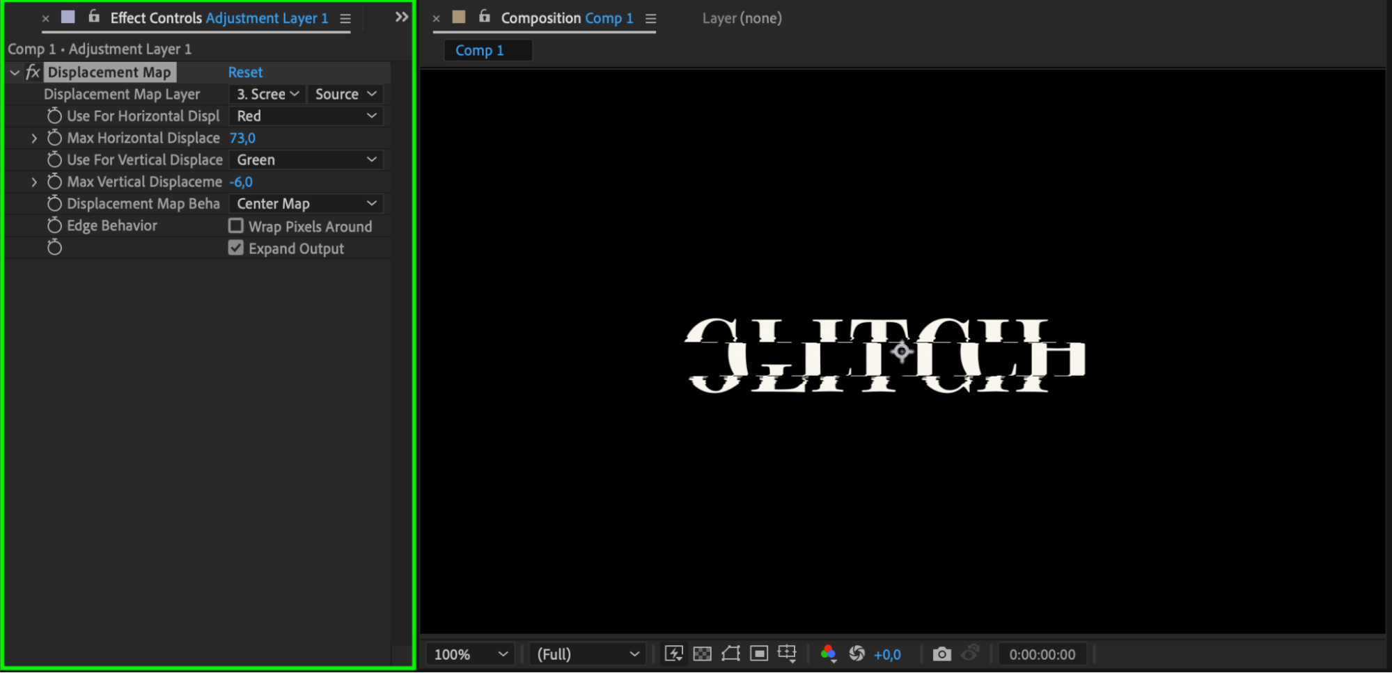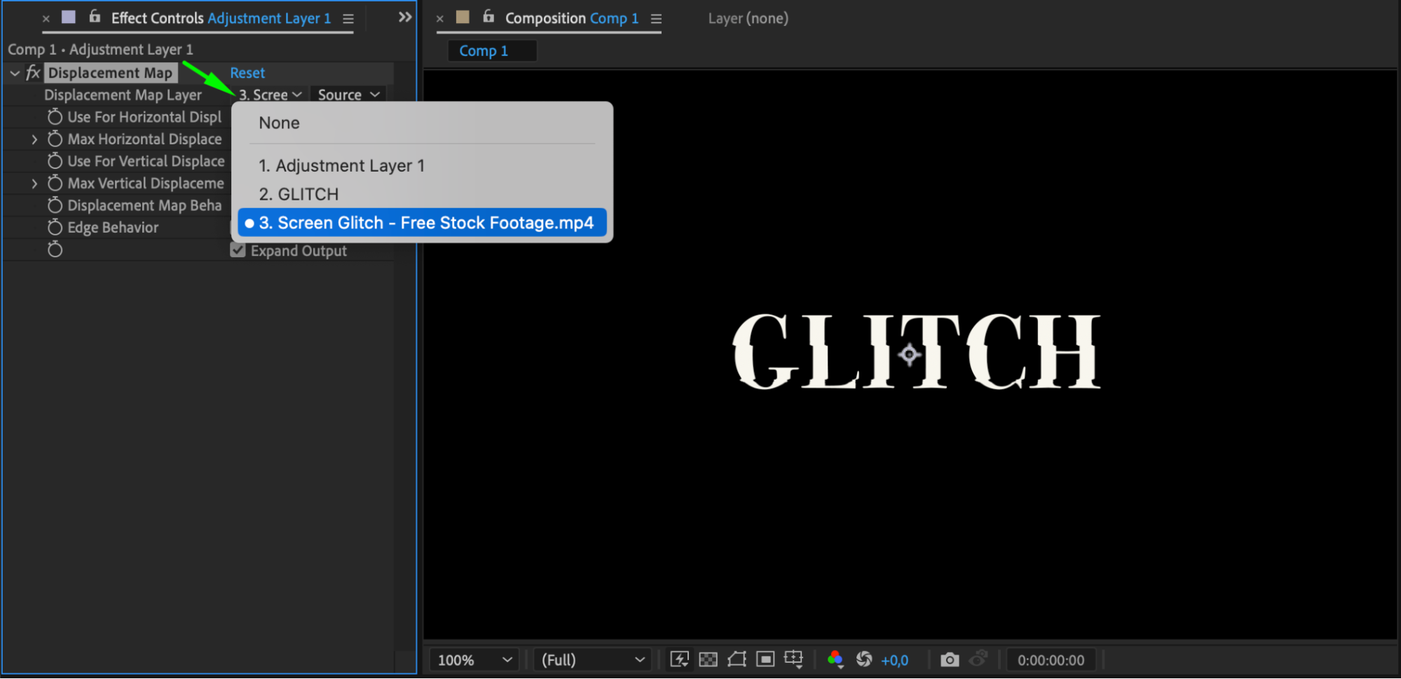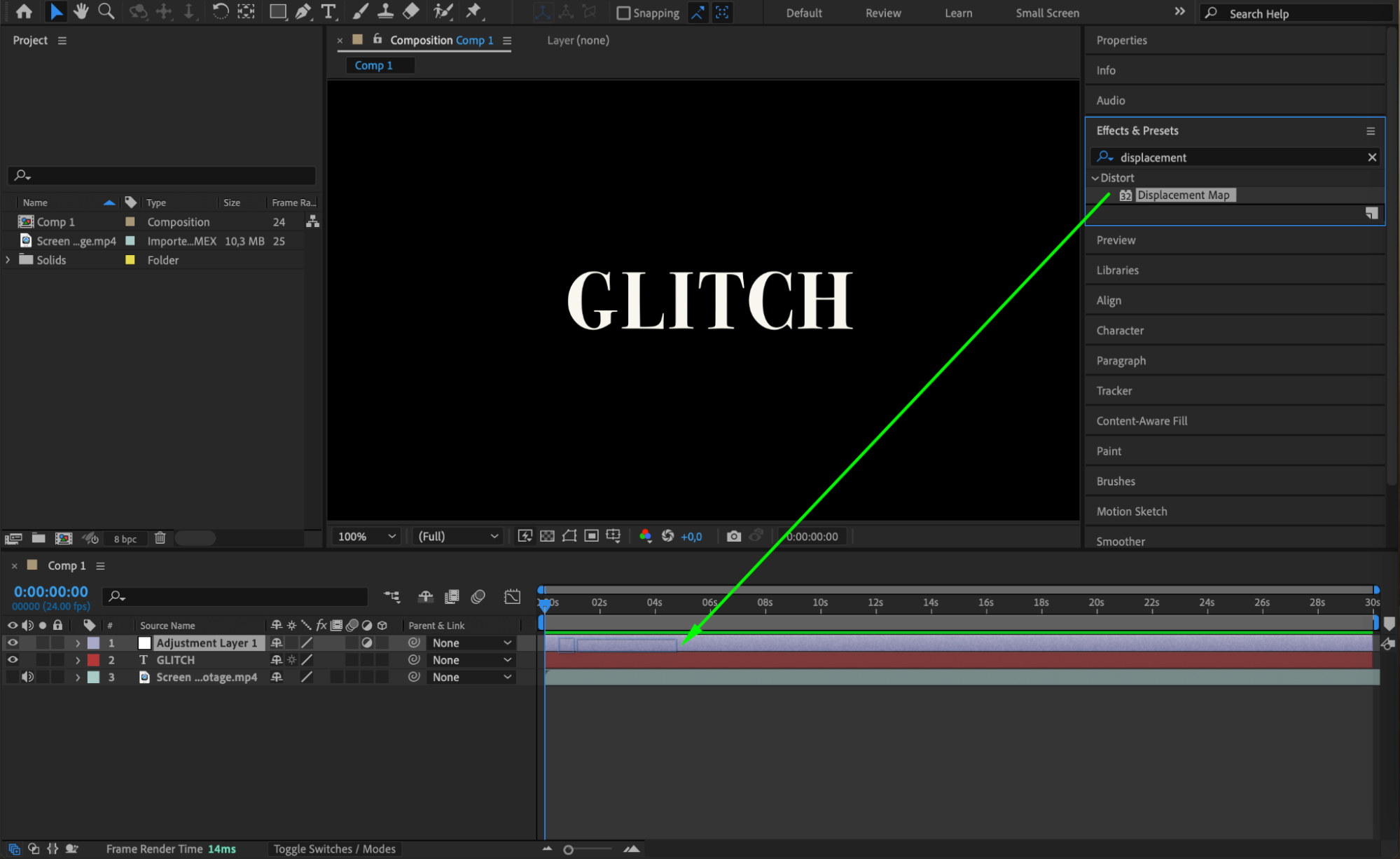 Apply the Displacement Map effect to the adjustment layer by dragging it from the Effects & Presets panel onto the layer. In the Effect Controls panel, set the Displacement Map Layer to the glitch footage you imported earlier. This will distort the text based on the glitch footage, creating the core of your effect.