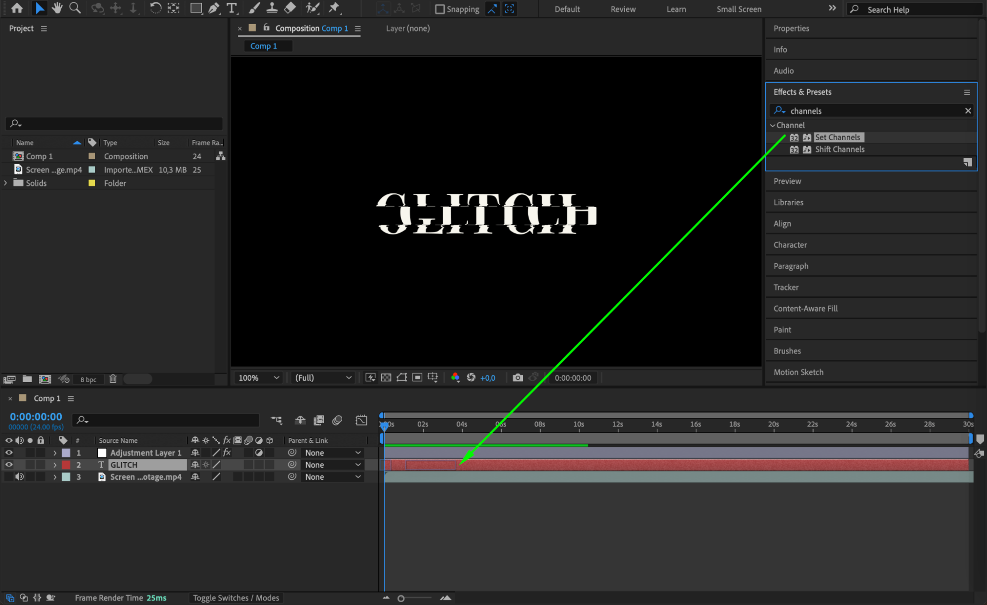 Now, apply the Set Channels effect to your text layer by dragging it from the Effects & Presets panel. This effect allows you to manipulate the color channels of your text, adding to the glitch effect.