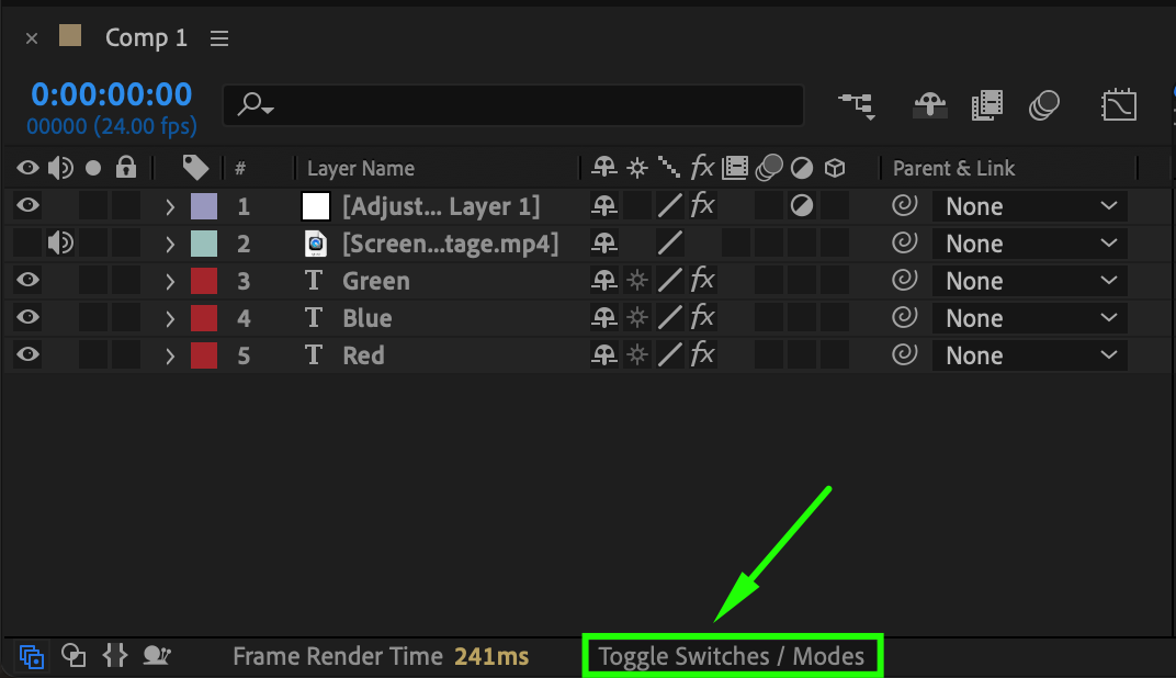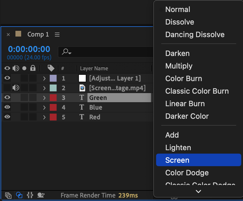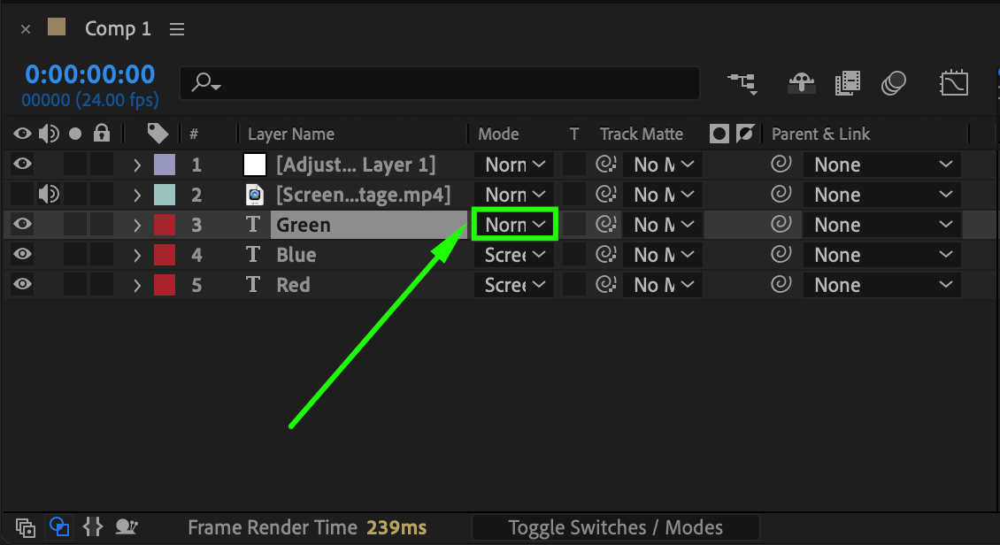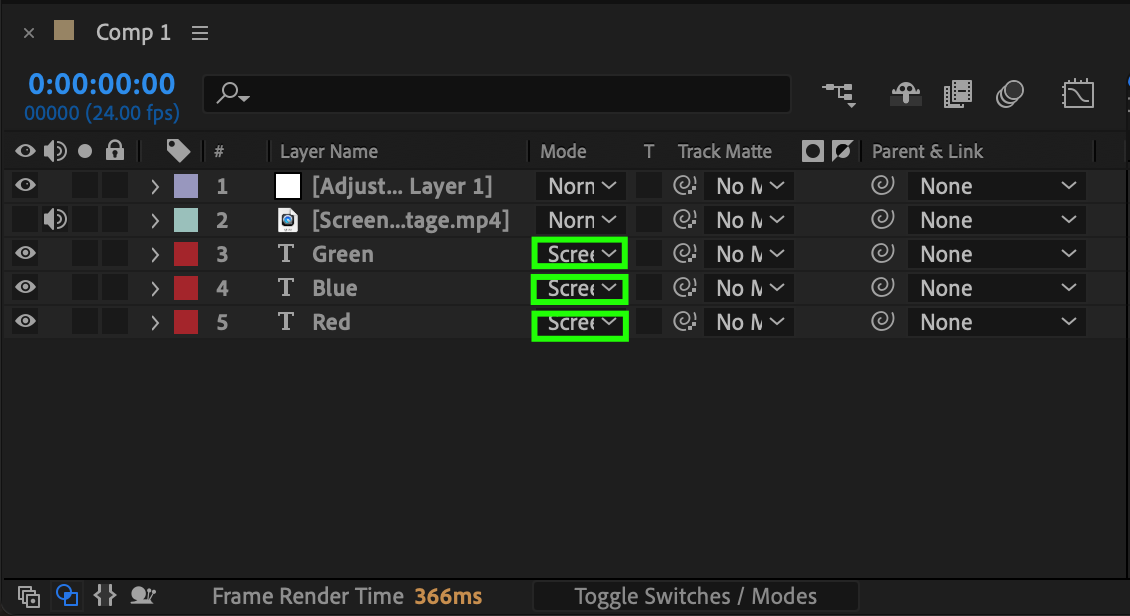 At the bottom of the timeline panel, click the Toggle Switches/Modes button. Set the blending mode of each text layer (Red, Green, and Blue) to Screen. This will blend the layers together, creating a composite image with a glitchy color effect.