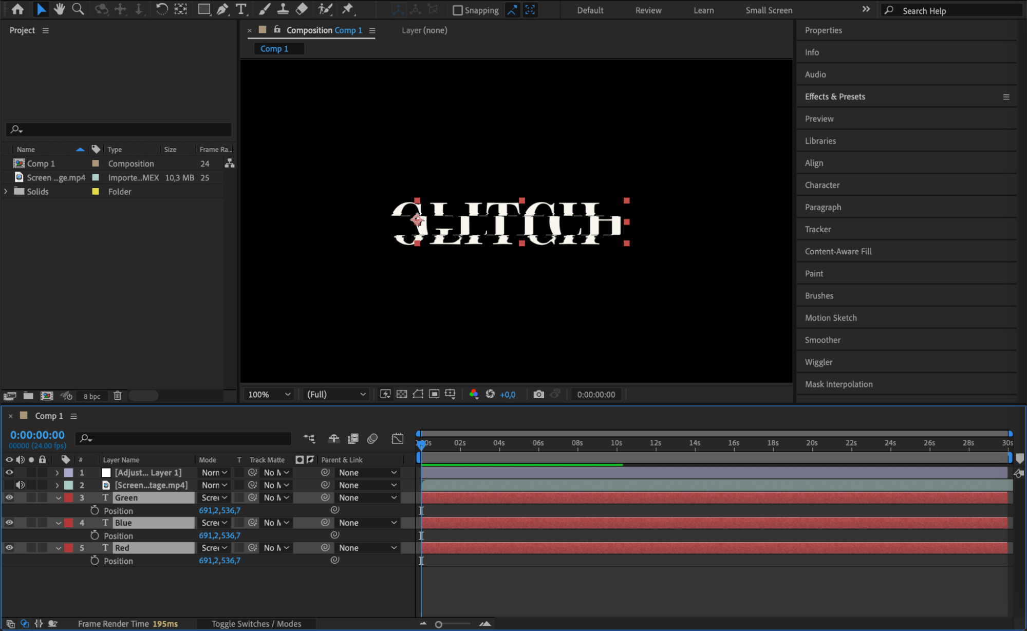 Select all the text layers and press P to reveal the Position property. Slightly offset the position values of each layer to create a misalignment between the colors, enhancing the glitch effect. Experiment with the values until you achieve the desired result.